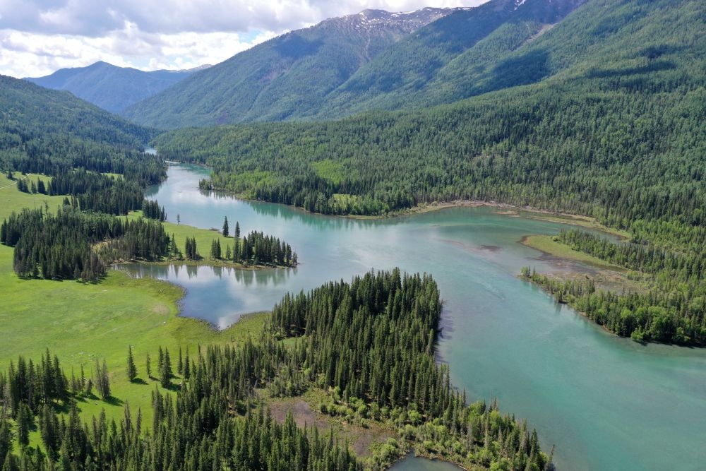新疆阿勒泰地区喀纳斯景区神仙湾景色(无人机照片)。新华社记者 沙达提 摄