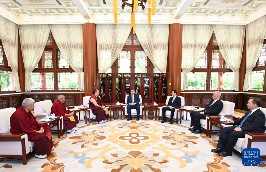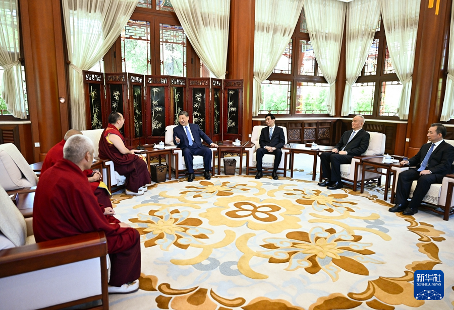 习近平接受班禅额尔德尼·确吉杰布拜见 王沪宁蔡奇陪同接受拜见 6月6日,中共中央总书记、国家主席、中央军委主席习近平在北京中南海接受班禅额尔德尼·确吉杰布拜见。新华社记者 谢环驰 摄 新华社北京6月6日电 中共中央总书记、国家主席、中央军委主席习近平6日在中南海接受班禅额尔德尼·确吉杰布拜见。习近平勉励他以十世班禅大师为楷模,努力成为佛学造诣精深、受僧俗信众爱戴的藏传佛教活佛,在促进民族团结、宗教和顺、西藏稳定发展进步中作出更大贡献。 中共中央政治局常委、全国政协主席王沪宁,中共中央政治局常委、中央办公厅主任蔡奇陪同接受拜见。 班禅向习近平敬献哈达,介绍了他近年来的学习工作情况。习近平对他在各方面取得的进步表示祝贺。 6月6日,中共中央总书记、国家主席、中央军委主席习近平在北京中南海接受班禅额尔德尼·确吉杰布拜见。这是班禅向习近平敬献哈达。新华社记者 谢环驰 摄 习近平希望班禅继承藏传佛教爱国爱教光荣传统,坚决维护祖国统一和民族团结。在学业上潜心精进,不断深化宗教学修、提高宗教造诣,加强各方面知识的学习和掌握。在工作上积极有为,为推动铸牢中华民族共同体意识、系统推进我国宗教中国化、促进西藏现代化建设更好发挥作用。在修养上持重善律,带头守法持戒,涵养优良品德和高尚情操。 6月6日,中共中央总书记、国家主席、中央军委主席习近平在北京中南海接受班禅额尔德尼·确吉杰布拜见。新华社记者 燕雁 摄 班禅表示,一定牢记习近平总书记谆谆教诲,以十世班禅大师为榜样,坚定拥护中国共产党领导、坚决维护祖国统一和民族团结。继续精进学修,不断提高宗教学识和综合素质,为促进民族团结进步、系统推进我国宗教中国化、促进西藏现代化建设贡献力量。 中共中央政治局委员、中央统战部部长李干杰参加活动。
