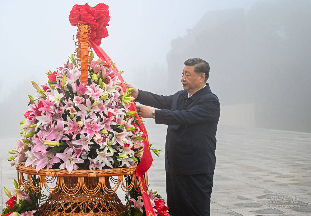 7月7日至8日,中共中央总书记、国家主席、中央军委主席习近平在山西考察。这是7日下午,习近平在位于阳泉市狮脑山的百团大战纪念碑广场,向八路军烈士敬献花篮。新华社记者 燕雁 摄