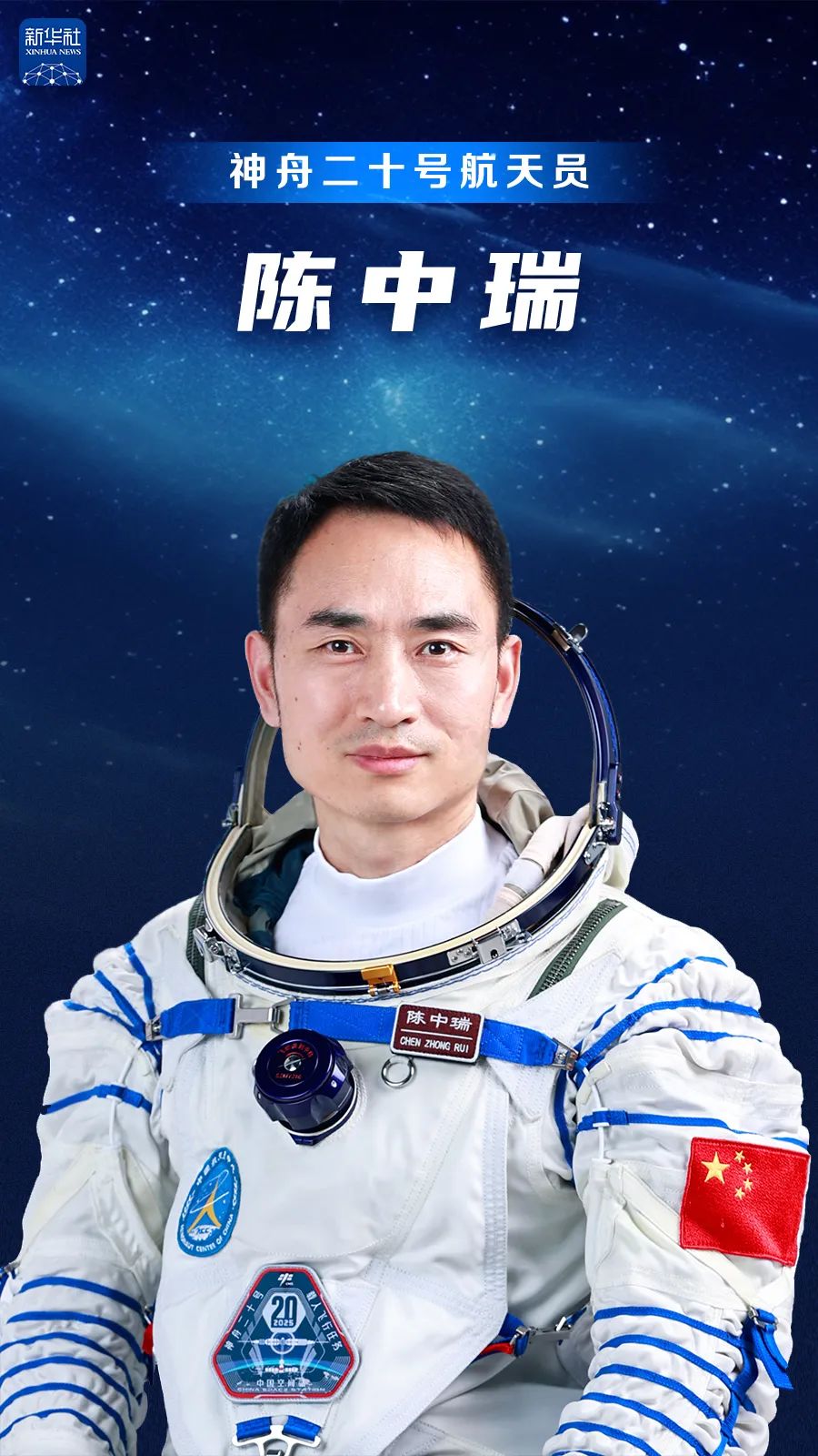 陈中瑞,男,汉族,籍贯河南滑县,学士学位。1984年10月出生,2003年9月入伍,2005年6月加入中国共产党,现为中国人民解放军航天员大队副大队长、四级航天员,空军上校军衔。曾任空军航空兵某旅飞行大队飞行员,被评为空军一级飞行员。2020年9月入选为我国第三批航天员。经全面考评,入选神舟二十号载人飞行任务乘组。