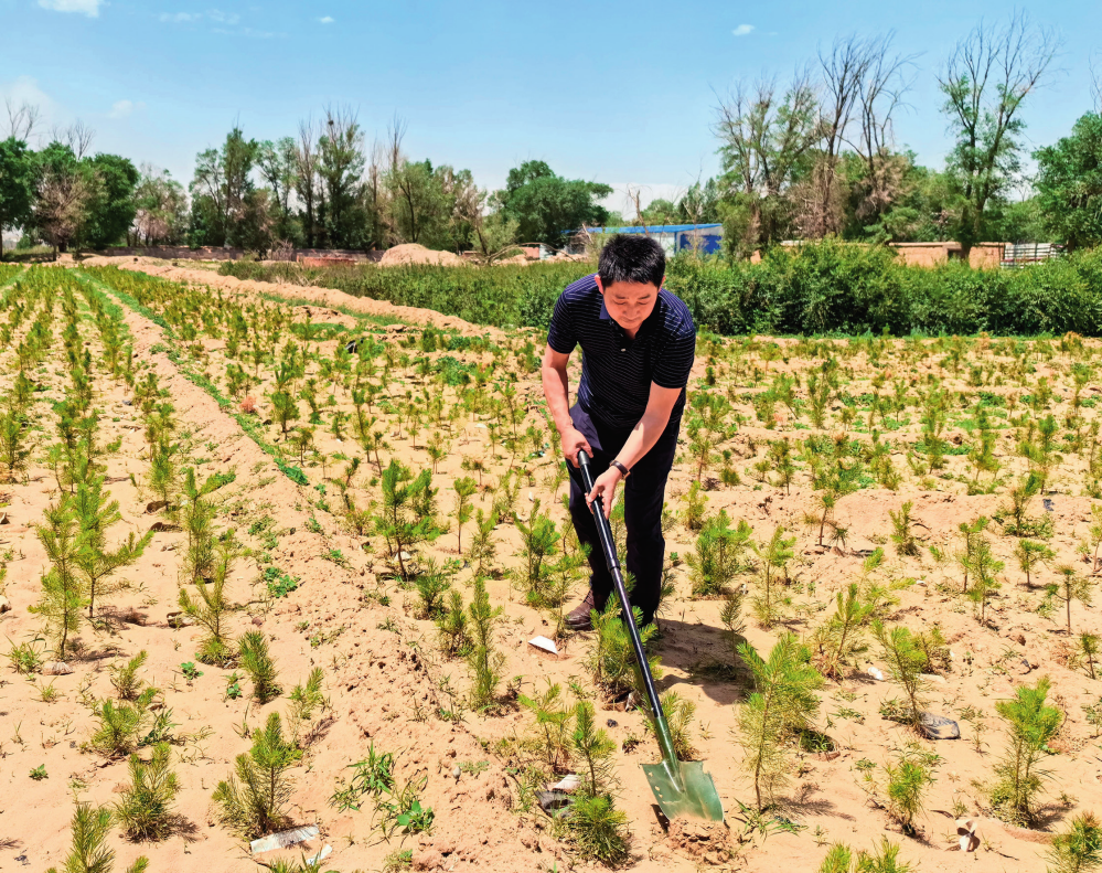 内蒙古包头市固阳县国营林场场长秦岭在林场苗圃查看碳汇造林苗木培育情况(2024年5月7日摄)郝嘉鑫摄