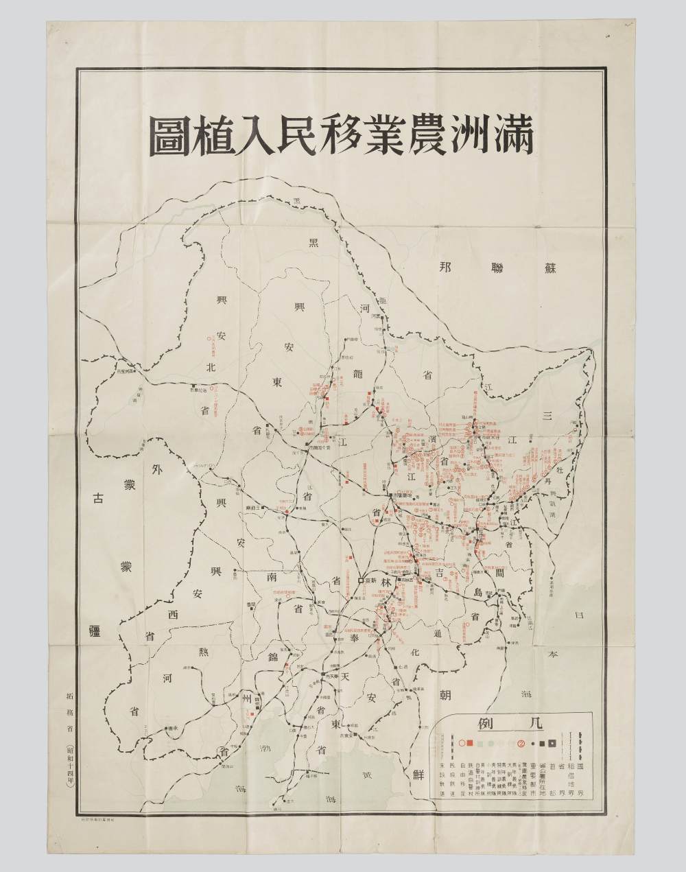 据介绍,1939年“满洲农业移民入植图”是日本昭和14年(1939年)由日本拓务省出版,日本杉田屋印刷所印刷,用100克凸版纸,呈红、黑、浅蓝三色,纵76厘米,横54厘米,保存完好。这是在1996年4月哈尔滨举行的近现代文物征集活动中,由民间人士捐赠,为东北烈士纪念馆收藏。