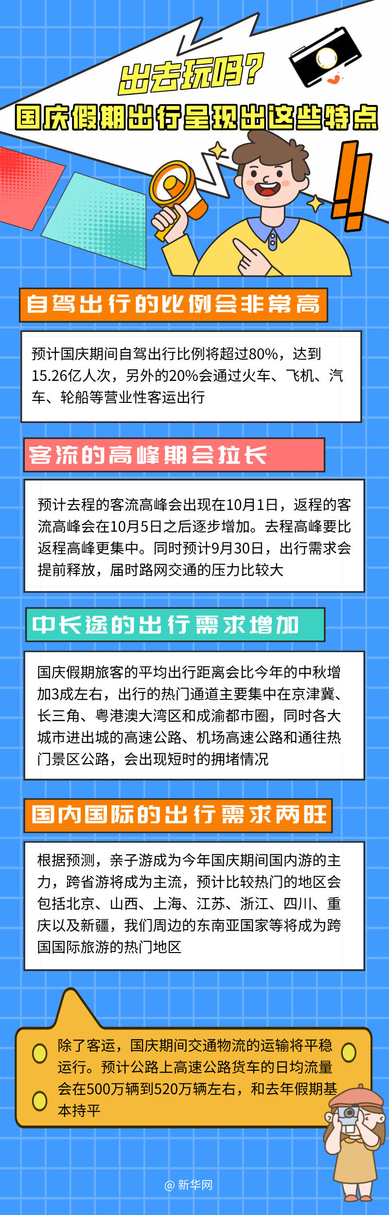“十一”假期明天就将开启。交通运输部预测,假期全社会跨区域人员流动量将达到19.4亿人次,平均每天2.77亿人次。强烈的出行意愿传递出流动的中国活力。假期出行将会呈现出哪些显著特点、主要的热门目的地有哪些、交通部门如何做好服务和安全保障工作?