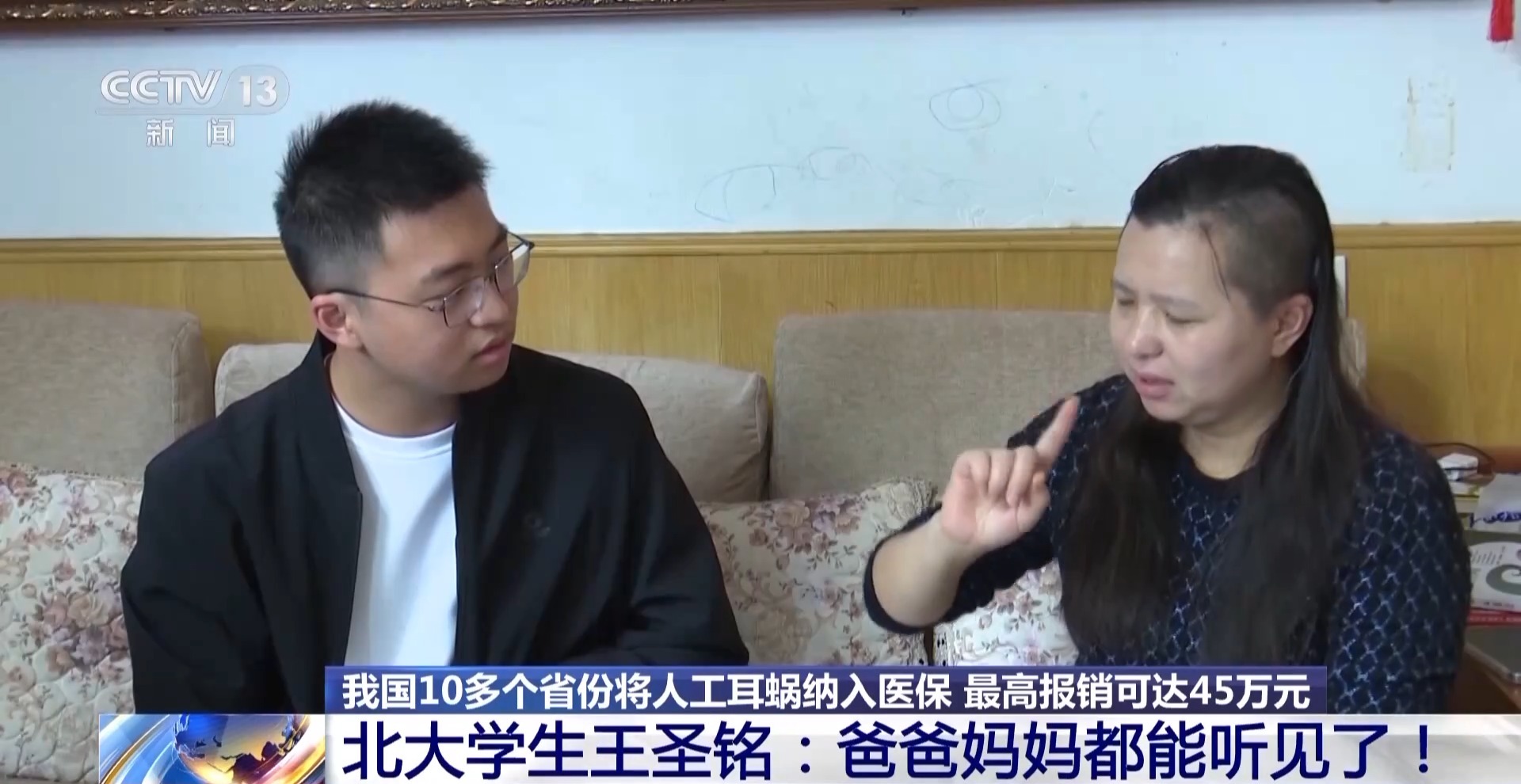 以前,人工耳蜗植入主要针对孩子,现在有了医保报销,一些耳聋的成年人也有条件植入人工耳蜗了。今年7月考上北京大学临床医学院的王圣铭一直有一个愿望,就是给耳聋的父母装上人工耳蜗,让他们听得见他叫一声“爸爸、妈妈”。在医保和公益基金的支持下,王圣铭的父母,在失聪40多年之后成功植入了人工耳蜗。就在不久前,来自河南濮阳的这对听力残疾的夫妇王天恩和宋慧,在北京大学人民医院植入了人工耳蜗。国庆假期,儿子从北京回来,一家人已经可以进行简单对话和交流了。