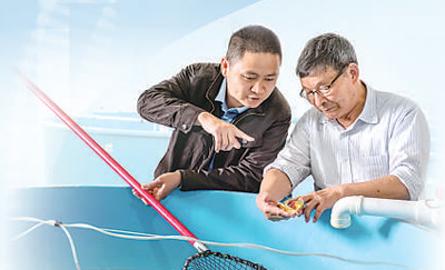 刘家富(右)和科研人员在研究鱼苗。 |
