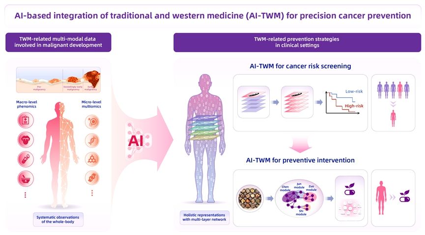 据悉,AI-TWM的核心在于利用基于生物网络的人工智能算法,系统发掘与肿瘤发生风险相关的中西医宏观模态特征,构建了中西医特征的肿瘤风险智能预警模型,实现肿瘤发生高风险人群的精准辨识。同时,通过团队自创的网络药理学分析方法,系统辨识肿瘤发生及干预机制的分子网络,并以该网络为靶标,从传统中药中发掘能有效抑制肿瘤发生的药物。