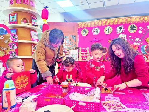 为让幼儿更好地了解中华优秀传统文化,加深对传统节日的认识,2024年12月31日,海勃湾区第八幼儿园在园内开展“知年俗 享年味 寻年趣”迎元旦主题活动。图为幼儿体验非遗项目。