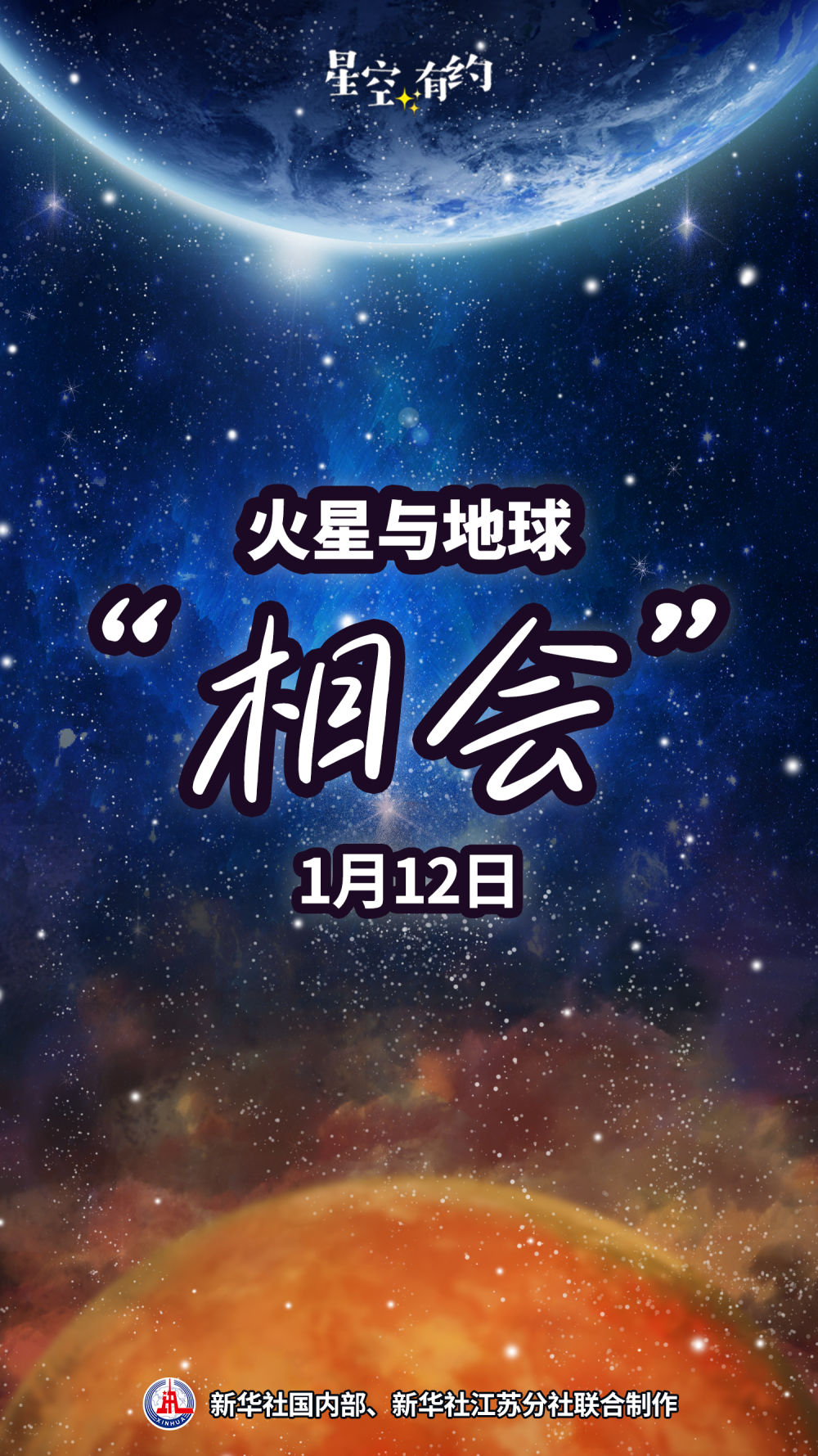 地球的“邻居”火星将于1月12日运行至本轮会合周期中距离地球最近的位置。届时,公众可以目睹近两年中最近、最大的火星。当天,火星与地球大约相距0.642个天文单位,约合9600万千米,视星等约为-1.4等,好比两颗行星在各自的轨道上近距离“相会”。