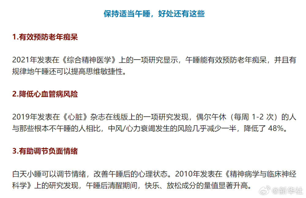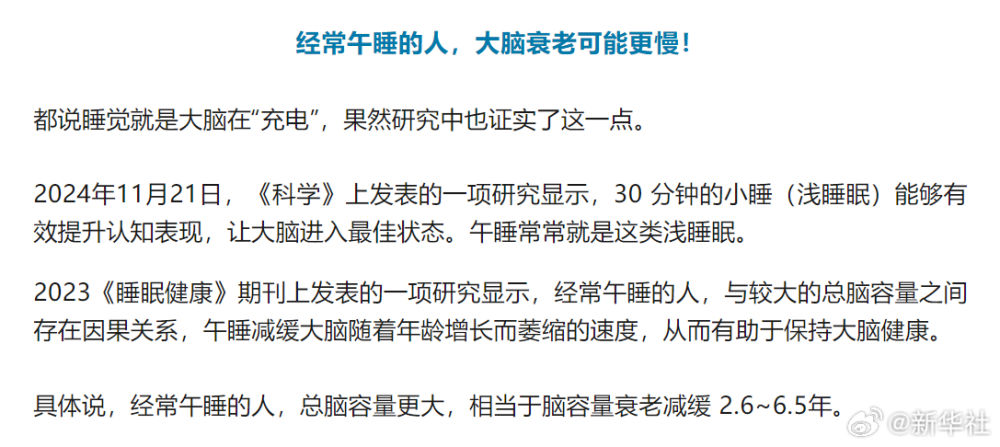 “中午不睡,下午崩溃。”忙碌的生活中,午睡已经成为许多人缓解压力、恢复精力的重要习惯。最新的研究发现:那些经常午睡的人,大脑衰老可能更慢!那最佳午睡时长是多久?午睡要注意什么?一起来看看!