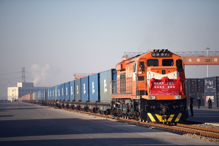 2021年12月29日,首列“青城号”呼和浩特—莫斯科中欧班列从沙良物流园驶出。新华社发(唐哲 摄)