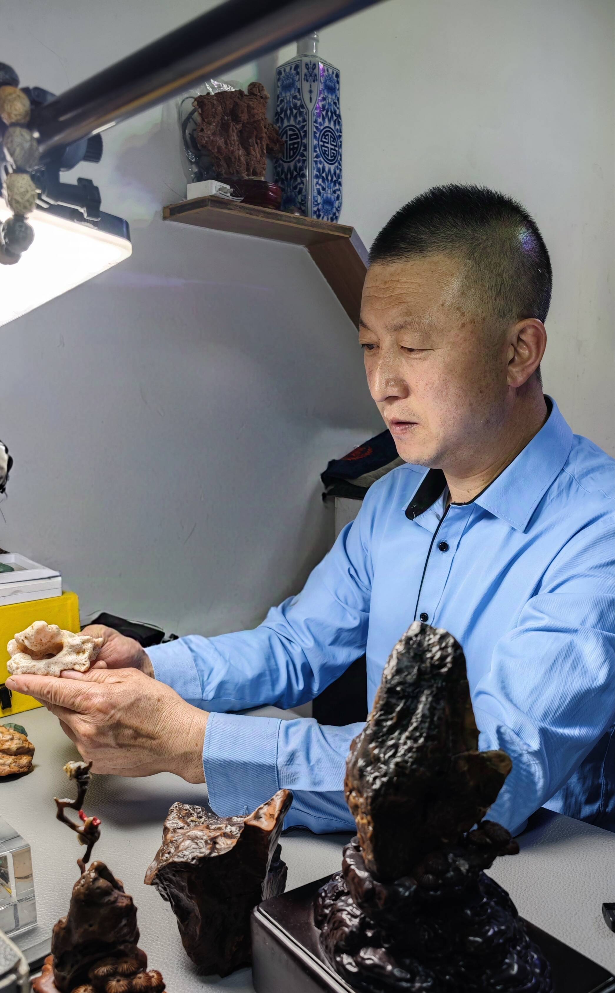 收集石头的过程,也是王泽雨不断学习成长的过程。每天只要一有闲暇时间,他就会沉浸在网络中,学习专业的藏石知识。为了更深入地了解不同类型的石头,他前往各个石头产地去探寻答案。“我到了阿拉善的苏宏图和恩格乌素才发现,不同地方的沙漠漆真的有很大差别,只有苏宏图的沙漠漆,才会有那种玻璃质的光泽,这些都是亲眼看到才能体会的。”王泽雨一边回忆一边说道。