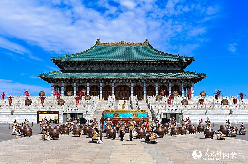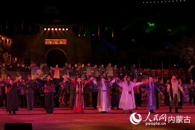 5月1日,在鄂尔多斯市伊金霍洛旗鄂尔多斯文化产业园景区沉浸式剧场,演员表演实景剧《凤鸣九曲》。王正摄