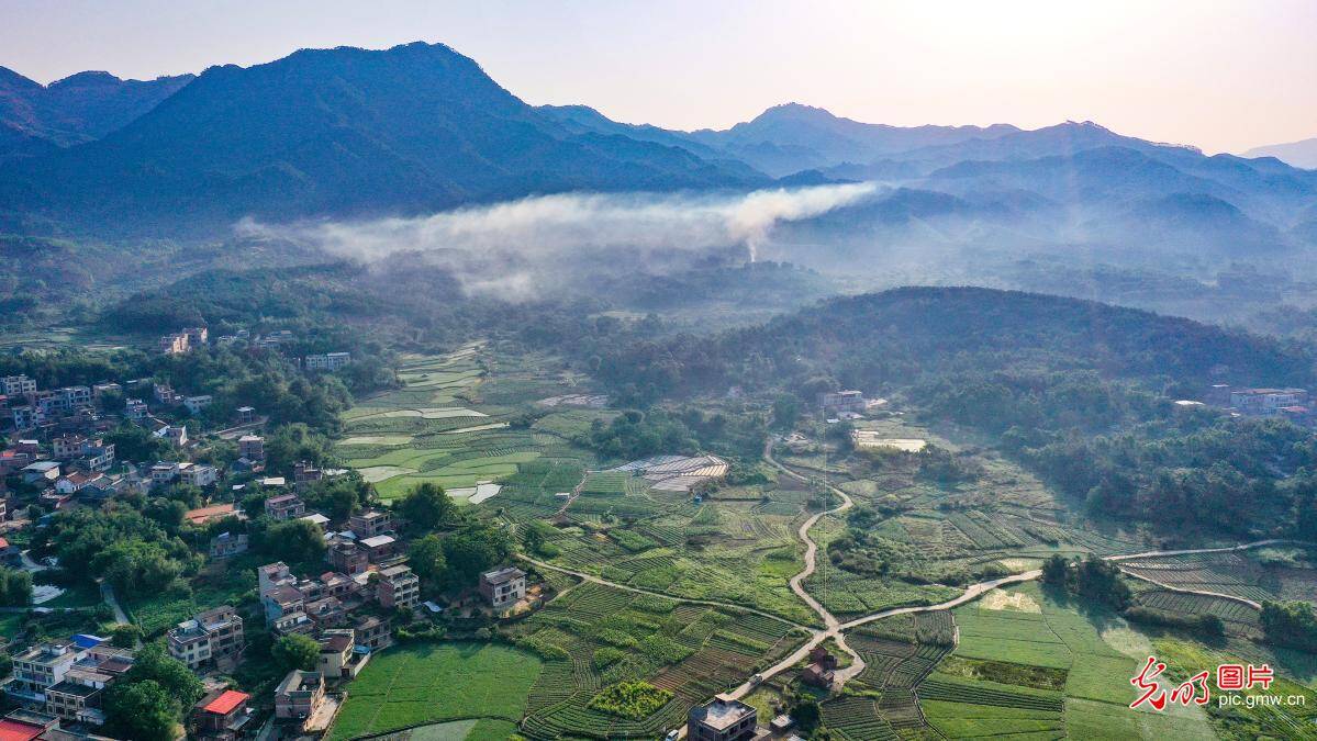5月17日,航拍广西梧州市苍梧县石桥镇永安村,田园、村庄、道路、薄雾交相辉映。(黎杰源)