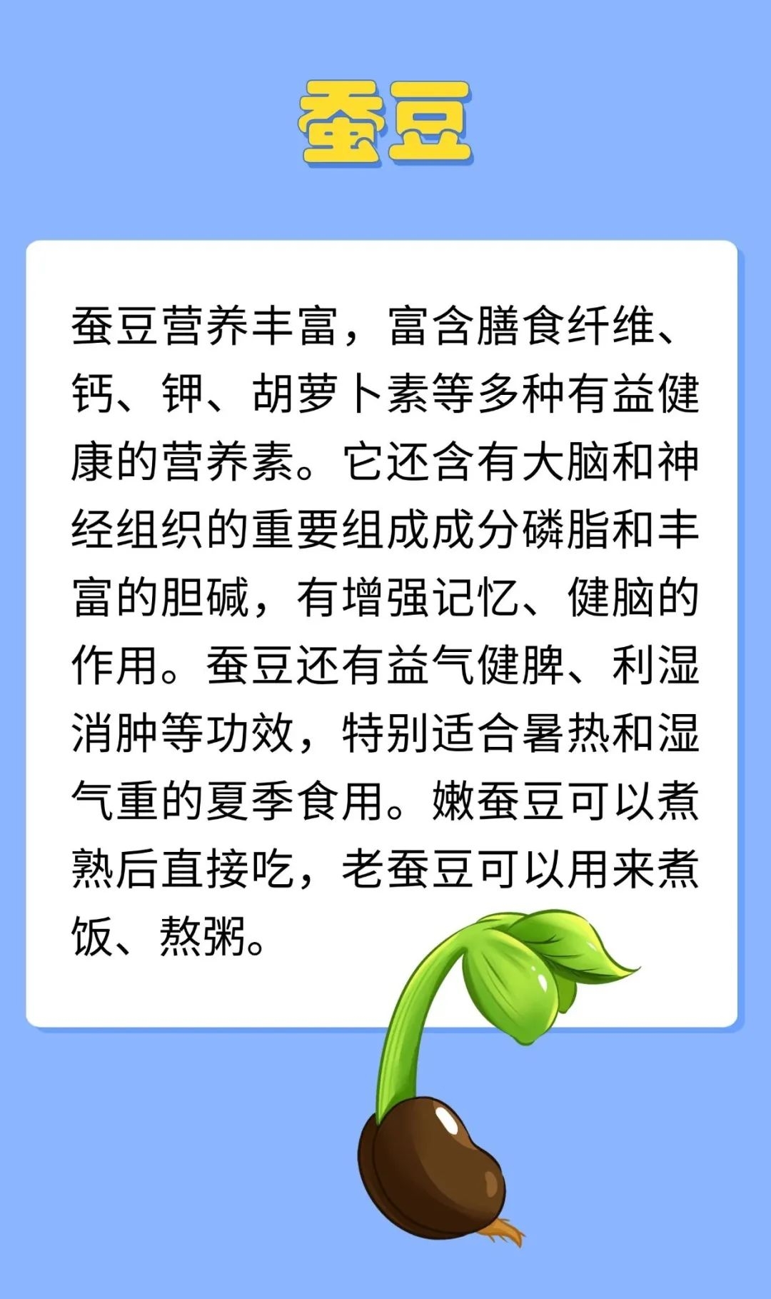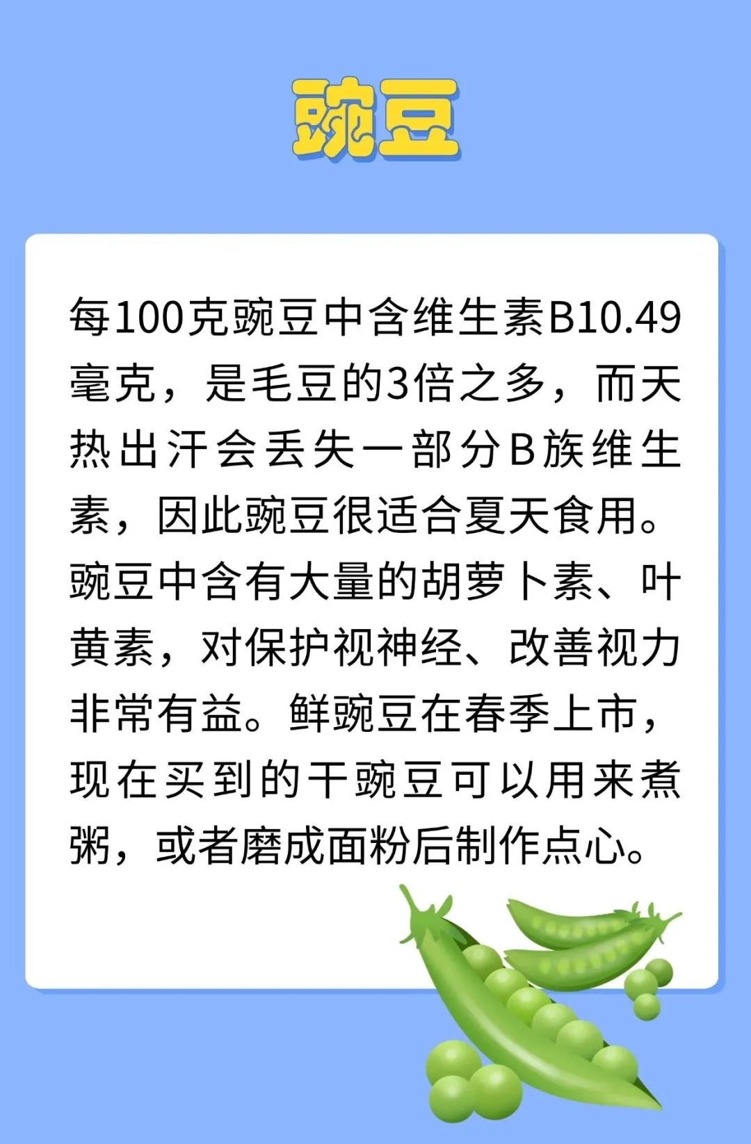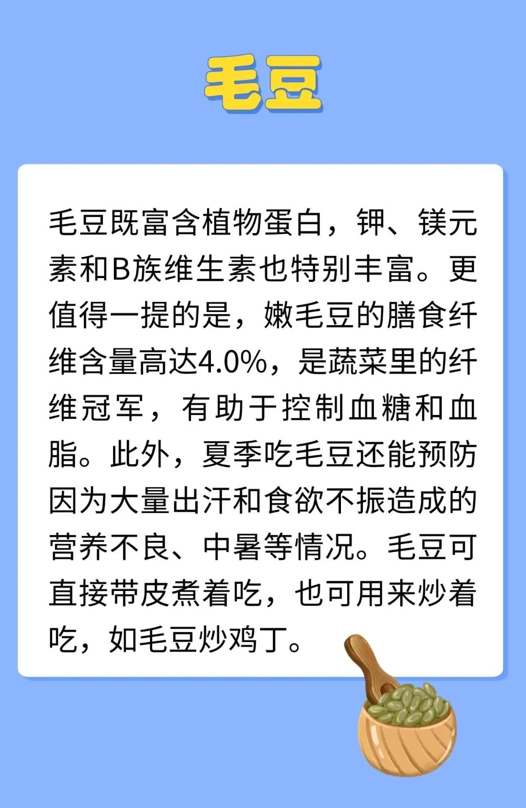 夏天,雨水比较多,空气湿度大,中医认为湿气通于脾,容易导致脾失健运,所以人在夏天容易出现脾虚。脾气虚是指脾功能不足,特点是吃得少,吃东西不香,食后腹胀,人懒乏力,四肢没劲,发展下去就会出现形寒肢冷、大便稀溏、腹冷浮肿。所以要及时调补。夏天多吃豆子,能够补充因出汗而损失的B族维生素和钾镁元素,又充足的蛋白质,是美味与营养兼得的好办法。