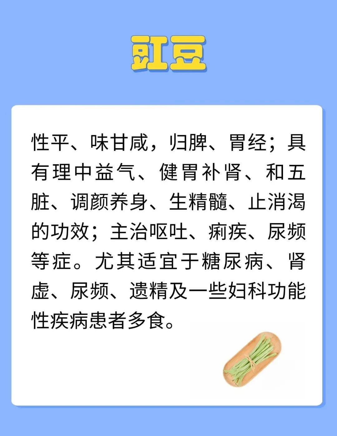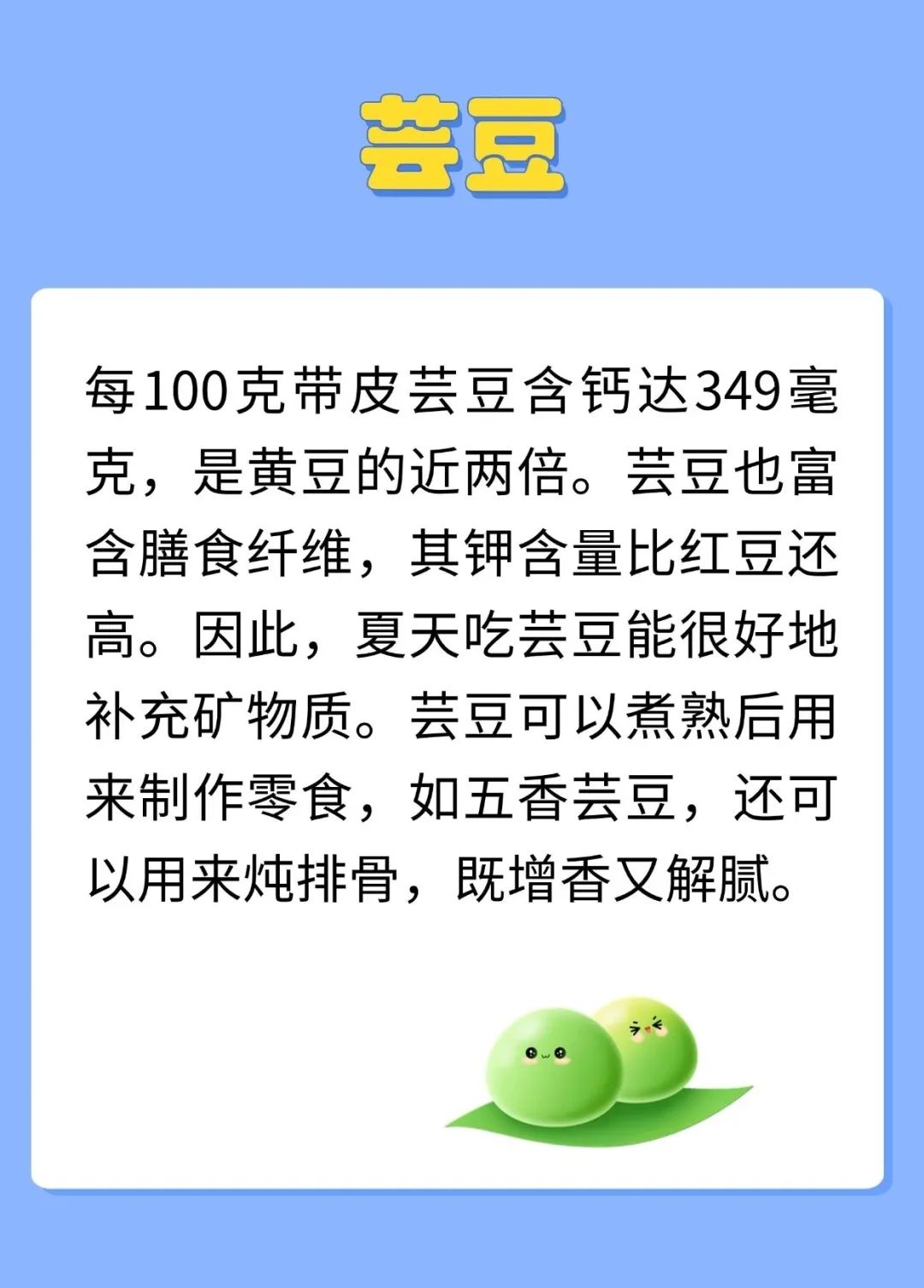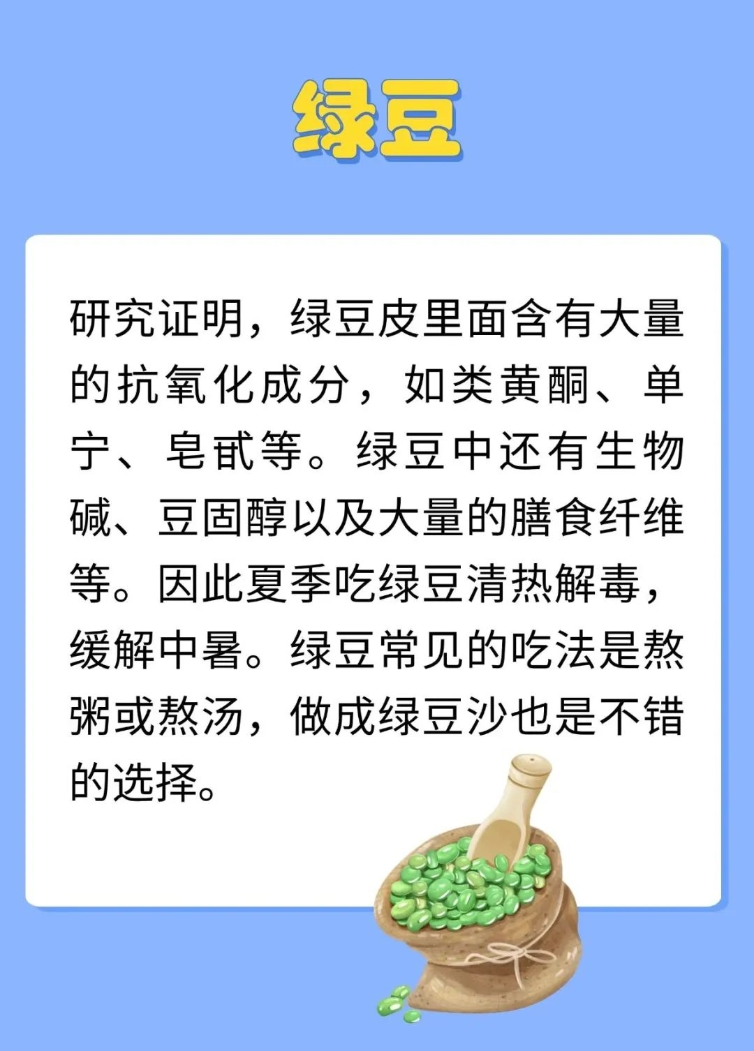 夏天,雨水比较多,空气湿度大,中医认为湿气通于脾,容易导致脾失健运,所以人在夏天容易出现脾虚。脾气虚是指脾功能不足,特点是吃得少,吃东西不香,食后腹胀,人懒乏力,四肢没劲,发展下去就会出现形寒肢冷、大便稀溏、腹冷浮肿。所以要及时调补。夏天多吃豆子,能够补充因出汗而损失的B族维生素和钾镁元素,又充足的蛋白质,是美味与营养兼得的好办法。