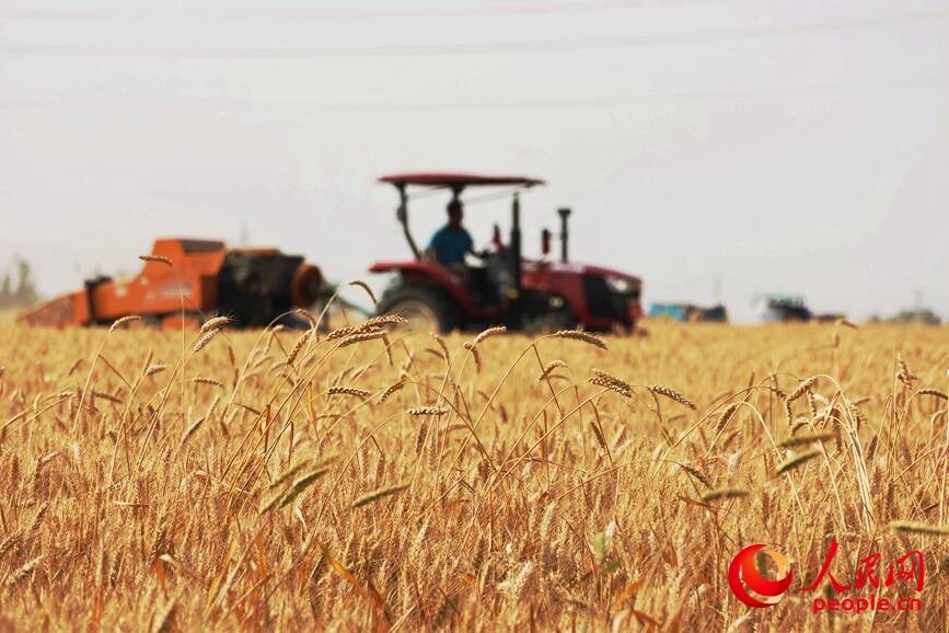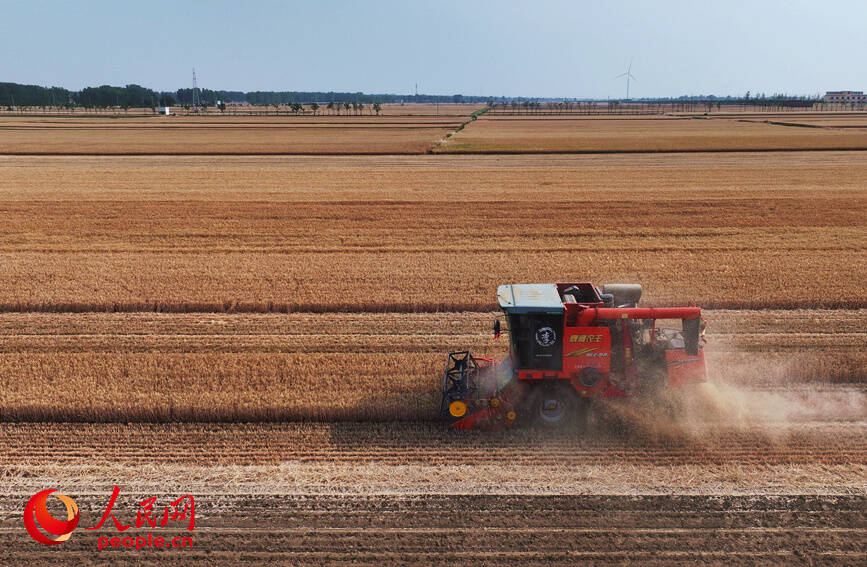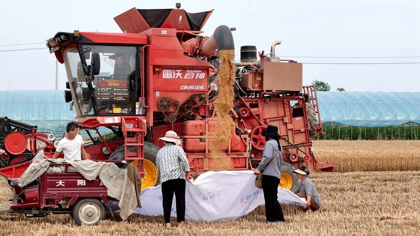 5月19日,河南多地拉响高温红色预警,滚烫的热浪席卷中原大地。在南阳、驻马店等地,大型联合收割机驰骋在金黄的麦田里,农民们不惧酷热,趁着晴好天气全力开展夏收,确保小麦颗粒归仓。(常力元 侯琳琳)