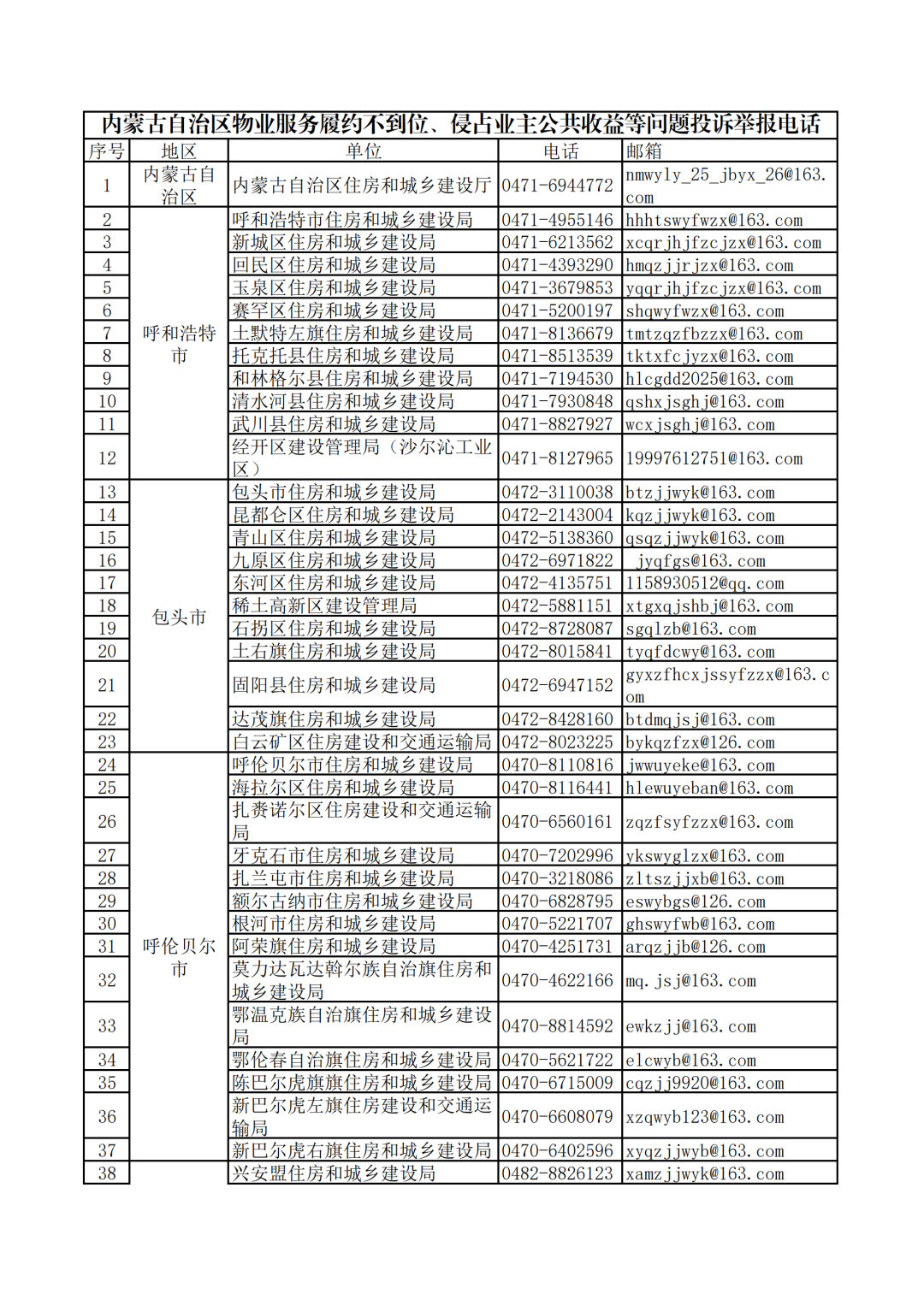 附件:内蒙古自治区物业服务履约不到位、侵占业主公共收益等问题投诉举报电话.xlsx