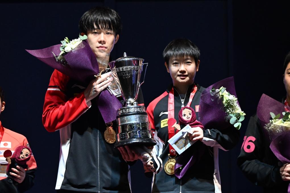 5月24日,混双冠军中国队组合王楚钦/孙颖莎(右)在颁奖仪式上。新华社记者 贺长山摄