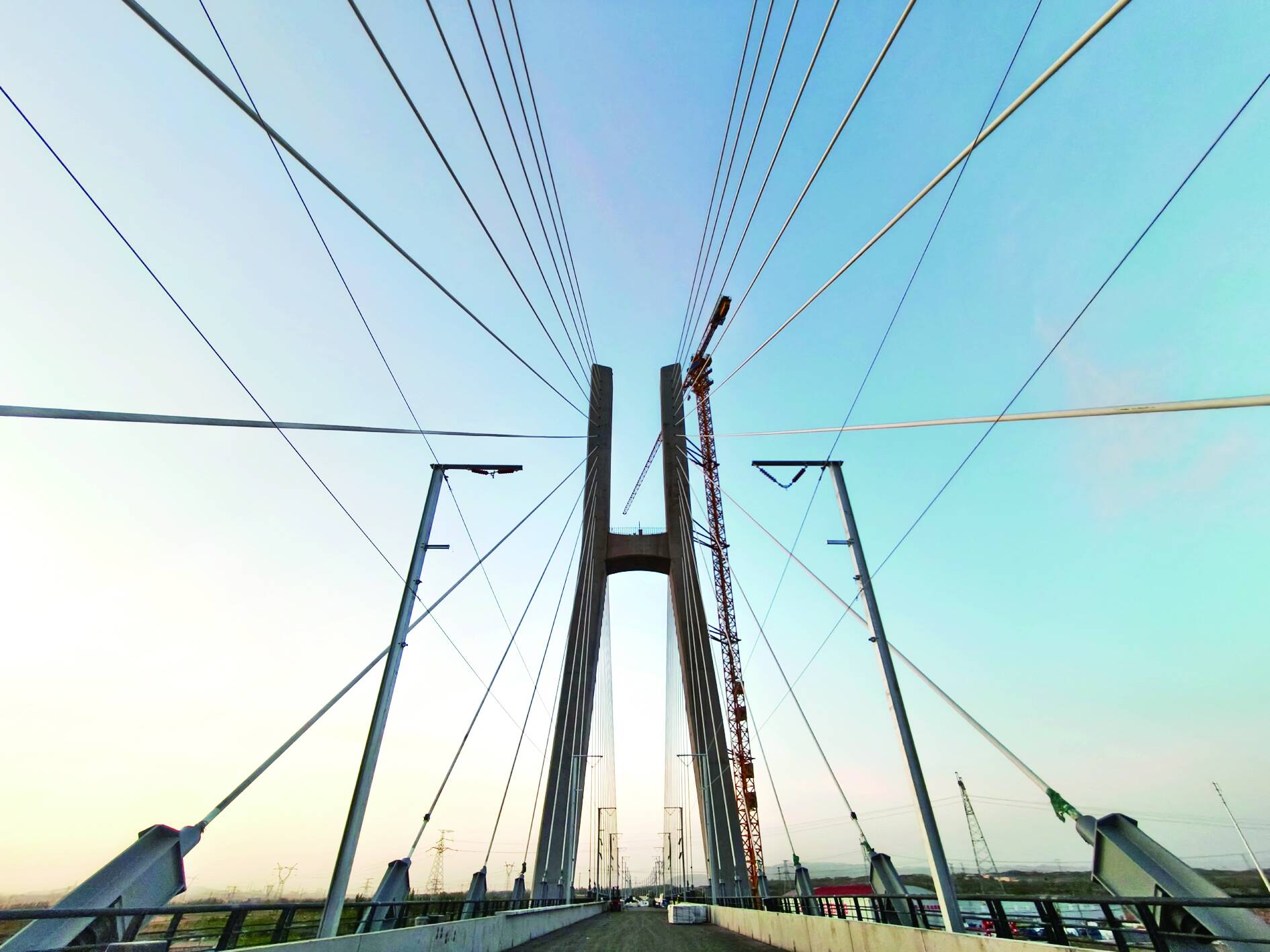 乌海黄河特大桥位于包银高铁内蒙古段与宁夏段的交界处,是包银高铁全线最高的桥梁,也是内蒙古第一座跨黄河铁路斜拉桥,全长 2190.79 米,主跨达 310 米,全桥共设置112根平行钢丝斜拉索,两个主塔高度分别为 114.5米、118 米,由中铁十局集团有限公司承建。2024年6月4日,该桥主墩主塔顺利封顶;2024年10月9日,该桥最后一节钢箱梁成功架设,全桥顺利合龙贯通;2025 年 5 月 20 日,该桥完成桥面系施工,为后续轨道铺设施工创造有利条件。