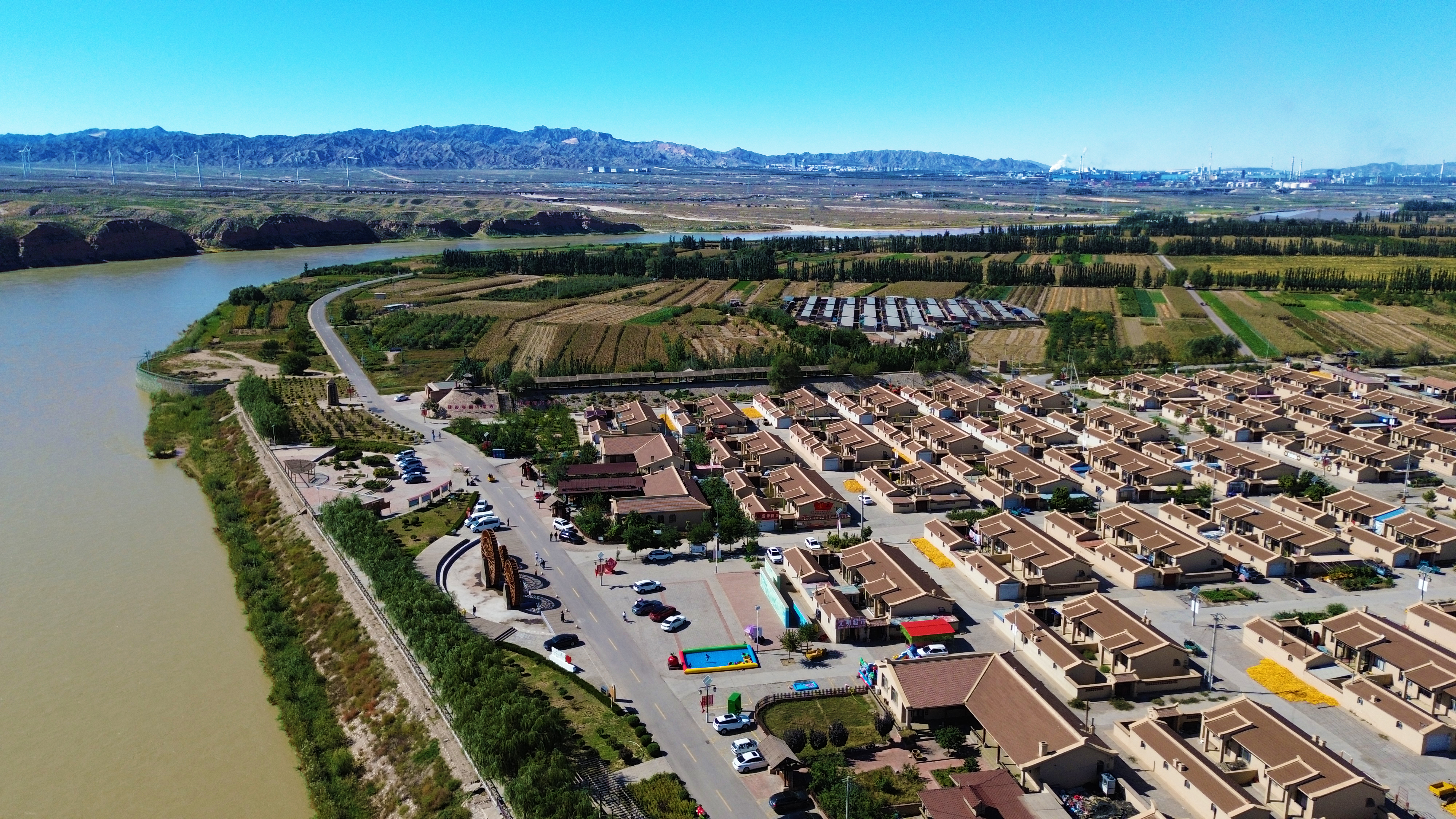在海南区赛汗乌素村极目远眺,黄河静静流淌,勾勒出乡村的灵动轮廓;错落的屋舍,棕褐色屋顶搭配浅色墙体,质朴又温馨;道路上车来人往,满是活力;周边田野广袤,绿意蔓延,农作物蓬勃生长,一幅和美乡景跃然眼前。图为海南区赛汗乌素村黄河西行客栈一景。