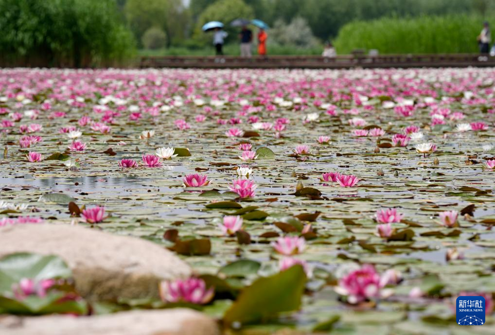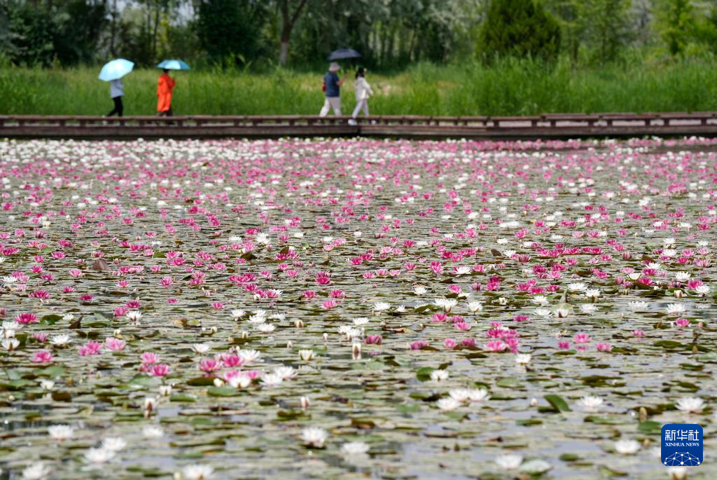 端午小长假期间,在位于宁夏银川市的中国花卉博览园湖面,睡莲竞相开放,吸引游客前来观赏、拍照。(王鹏)