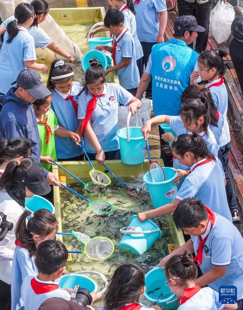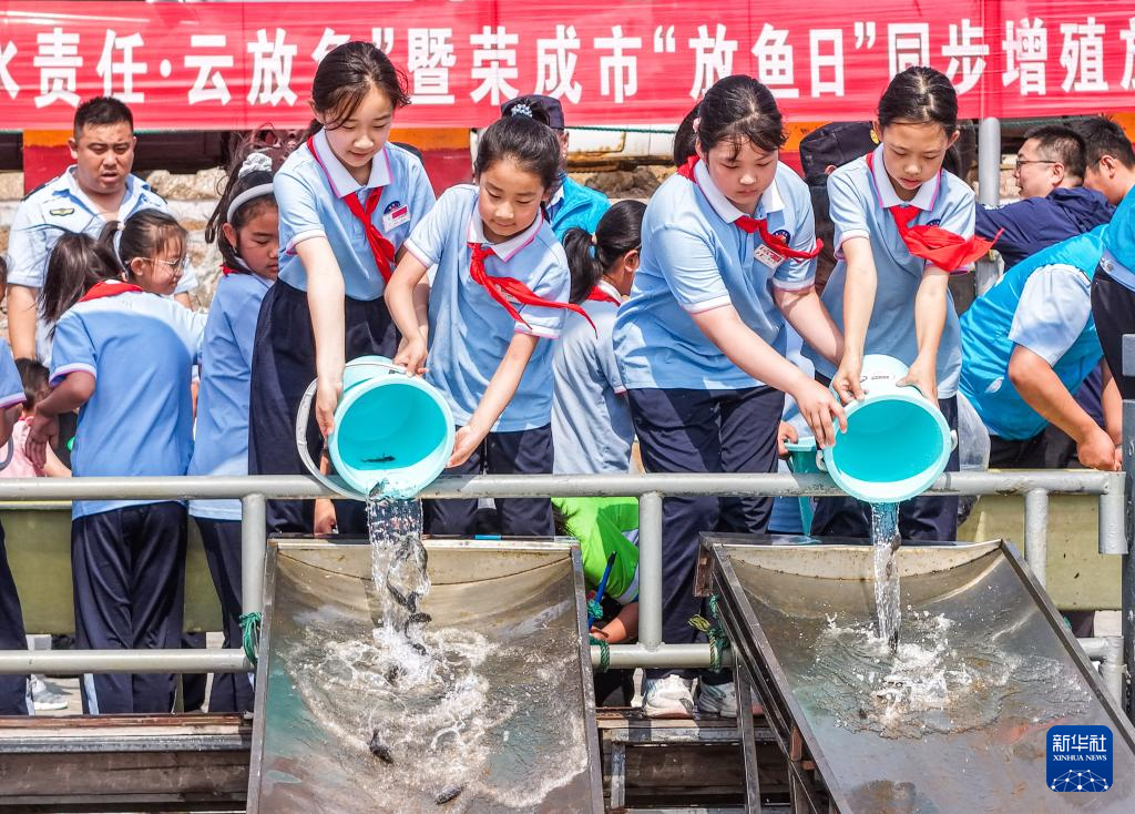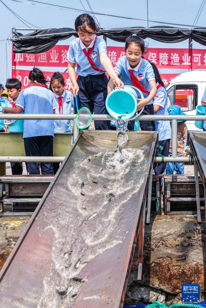 6月6日,在山东省荣成市好运角旅游度假区西霞口海域,市民和志愿者参加“养护渔业资源 共建生态海洋”增殖放流活动,将10万尾鱼苗放入大海,守护海洋生态,助力渔业可持续发展。(李信君)