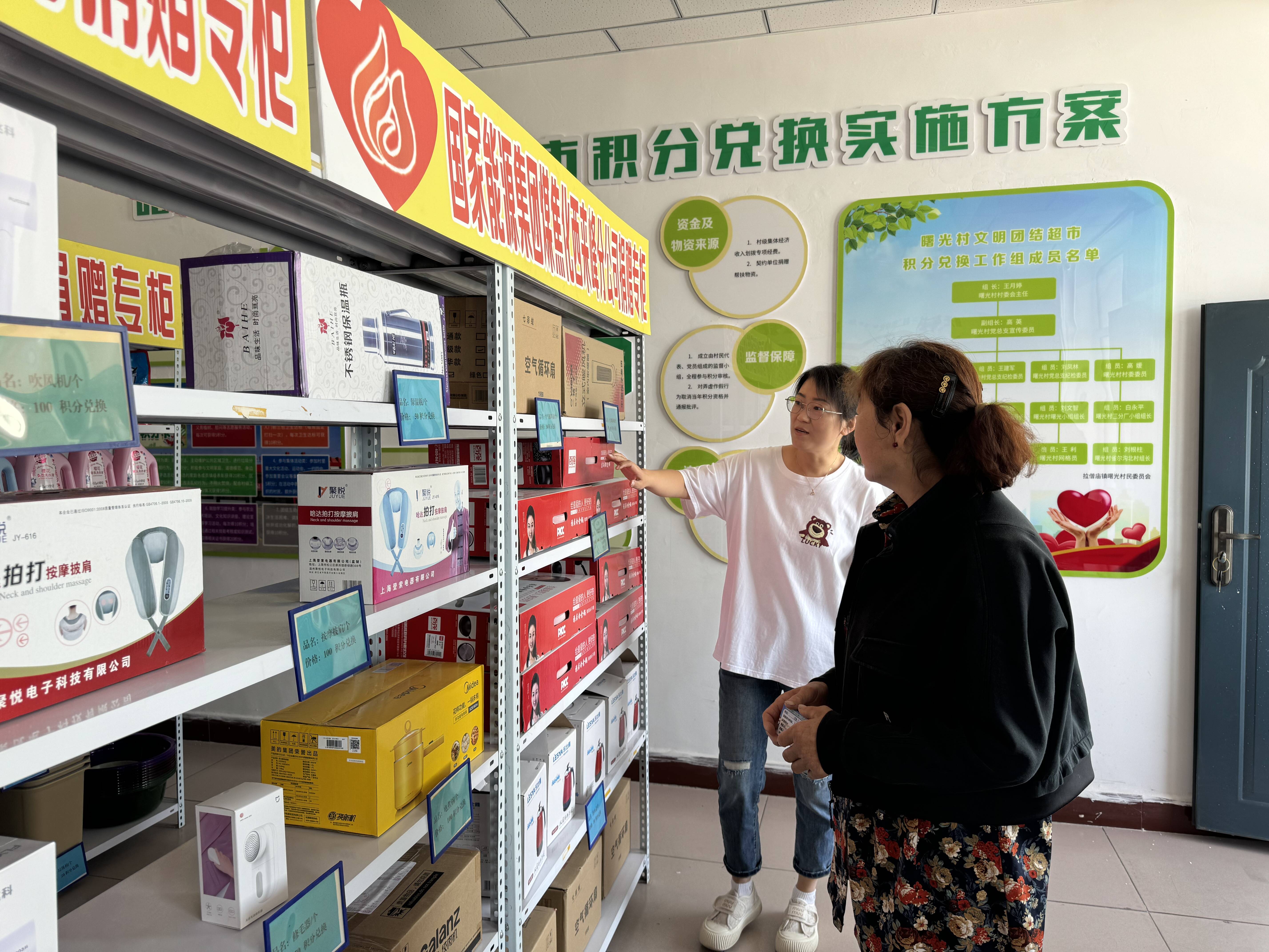 走进拉僧庙镇曙光村新时代文明实践站,只见货架上整整齐齐摆放着厨具、洗衣液、洗洁精、行李箱、四件套等日用品,各类日用品上标注着兑换所需积分,村民可根据自己参与村上各类文明实践活动获得的积分,由工作人员登记后,兑换相应物品。