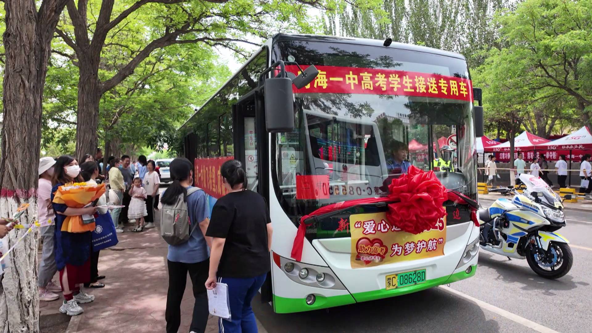 高考首日的清晨,市第六中学校园里,贴着“爱心送考”标识的公交车整齐列队。8点15分,随着最后一位考生快速走进车厢,这一延续了十四载的护航行动再次启程。