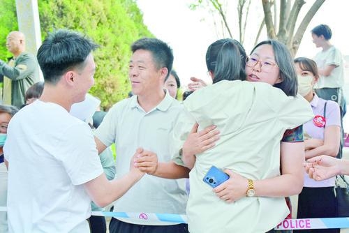 上午首场考试结束后,考生们有的飞奔向家长,有的与好友热烈拥抱,有的急匆匆跑到老师身前。