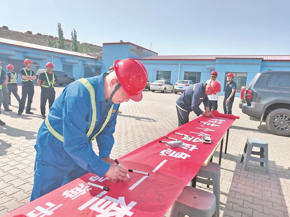 近日,海勃湾区应急管理局开展了2025年安全生产月“人人讲安全,个个会应急——查找身边安全隐患”主题行动。图为乌海市金和泰煤业集团恒实煤矿有限公司职工签署安全生产责任状。