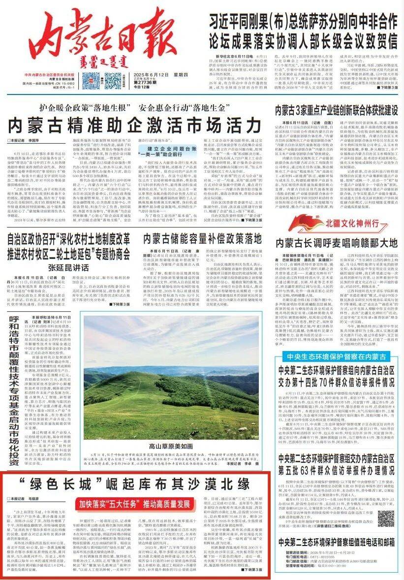 2023年,黄河“几字弯”攻坚战全面打响以来,鄂尔多斯启动实施库布其沙漠北缘锁边林带建设,在几代人艰苦奋斗打造的348公里锁边林的基础上补植补造,通过工程固沙+乔灌草结合,补齐提升剩余的72公里锁边林带。目前,通过实施“三北”工程六期项目,已完成43公里。去年至今,鄂尔多斯综合治理库布其沙漠东段、西段和中段的沙漠化土地,总投资10.88亿元,总治理面积70.64万亩。剩余29公里将于2025年全部完成,全线贯通库布其沙漠北缘锁边林带。
