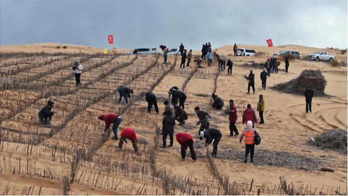 1981年,达拉特旗展旦召苏木的农牧民们用肩扛手挖的方式,在库布其沙漠北缘种下30万株沙柳,开启了锁边林建设的先河。