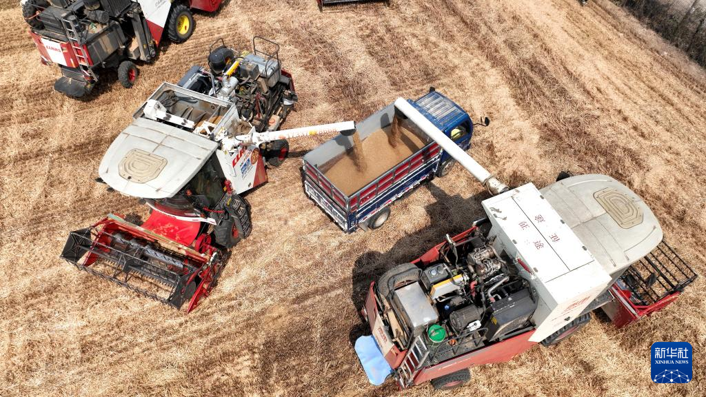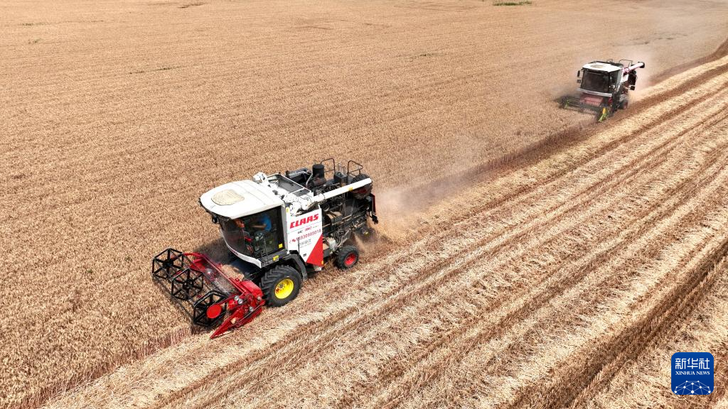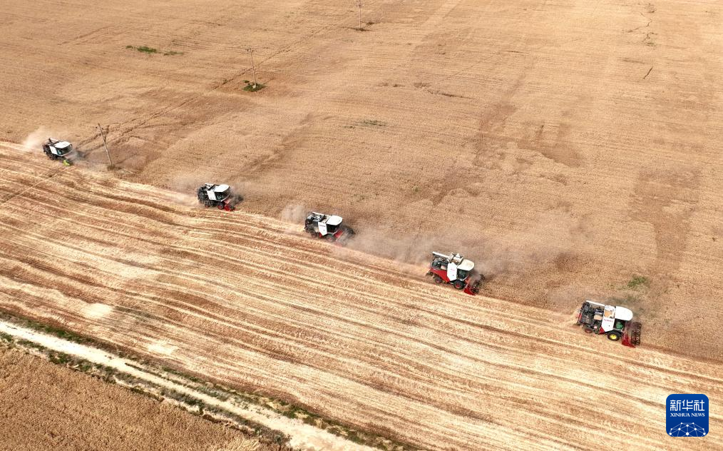 时下,河北省邢台市隆尧县61万亩小麦正值收获季,当地农民抢抓晴好天气开展机收作业。(牟宇)