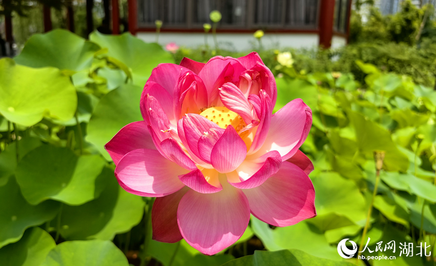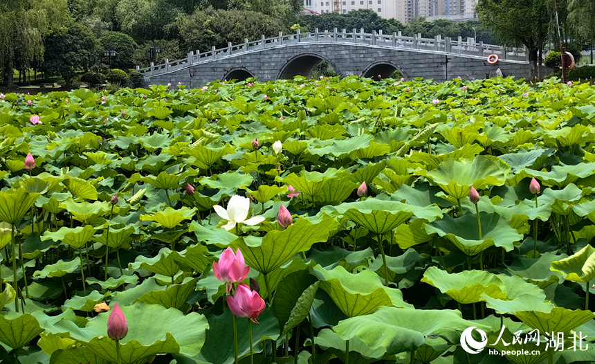 6月13日,为期一个月的武汉市沙湖公园第十一届荷花展拉开帷幕,400余种、3000余盆荷花吸引众多游客前来观赏。