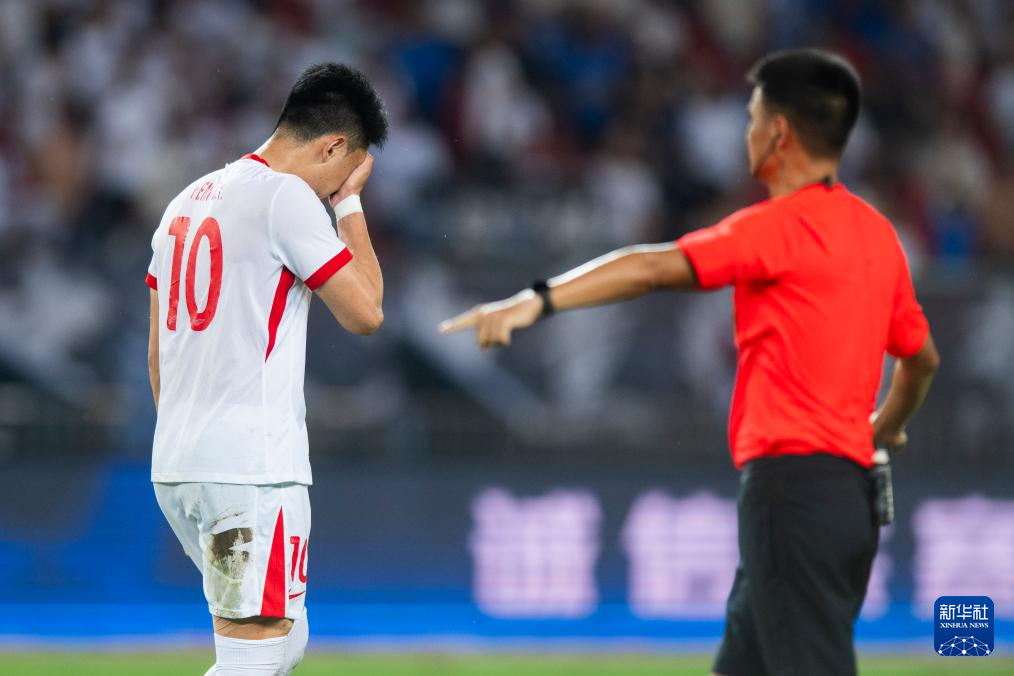 6月13日,青岛海牛队球员冯伯元(左)进球后,被主裁判李海新(右)判定越位在先,进球无效。