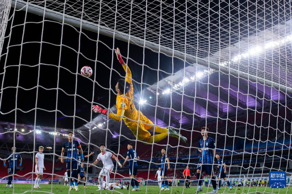 6月13日,武汉三镇队守门员邵镤亮(前)在比赛中扑救。