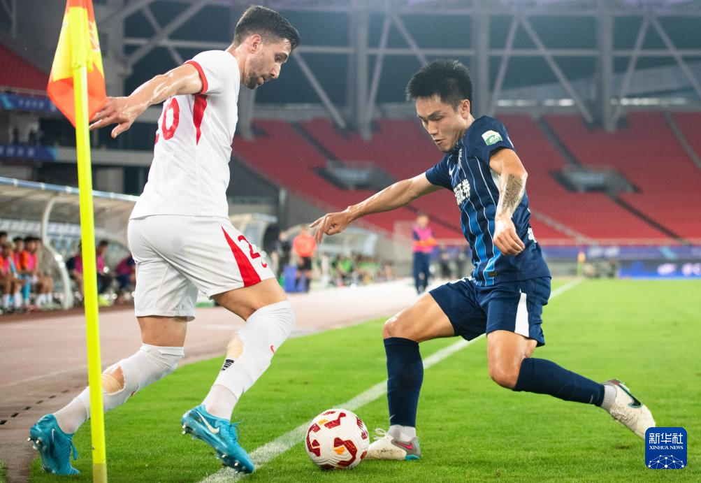 6月13日,青岛海牛队球员奥古斯托(左)在比赛中拼抢。