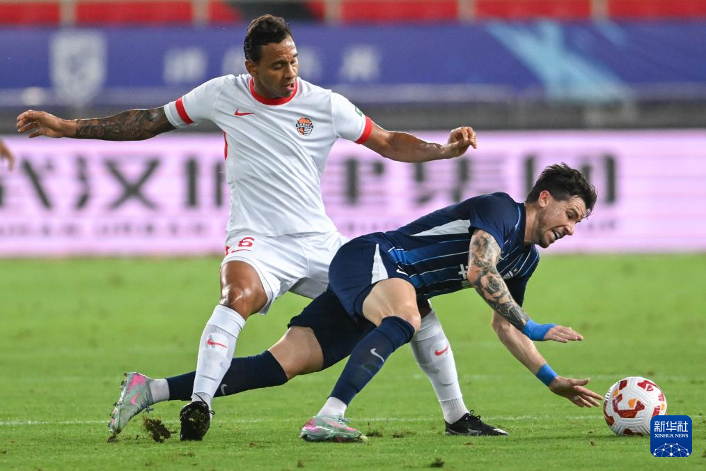 6月13日,武汉三镇队球员陈哲超(右)在比赛中与青岛海牛队球员尼古拉拼抢。