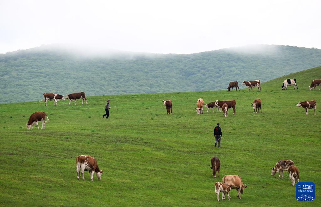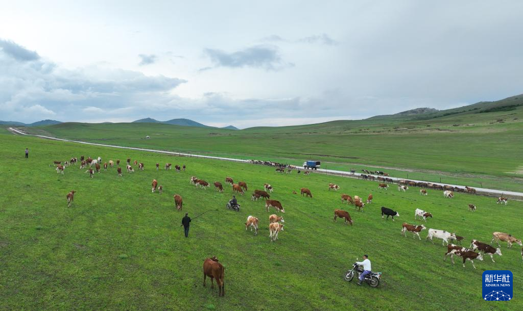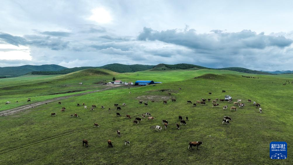夏日,内蒙古赤峰市阿鲁科尔沁草原绿意盎然,牧群在草原上觅食,呈现出一幅和谐的生态画卷。(贝赫)