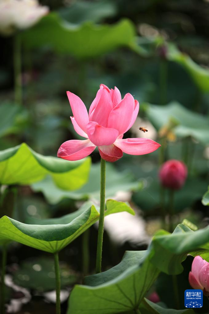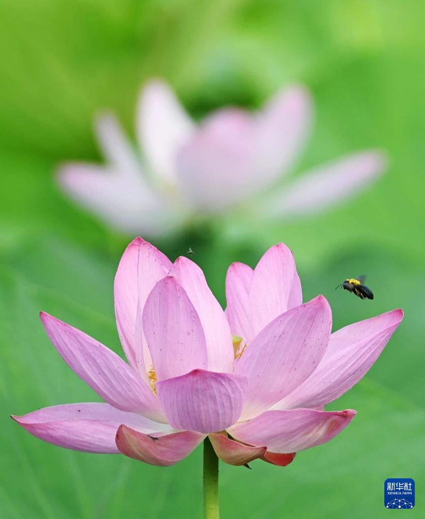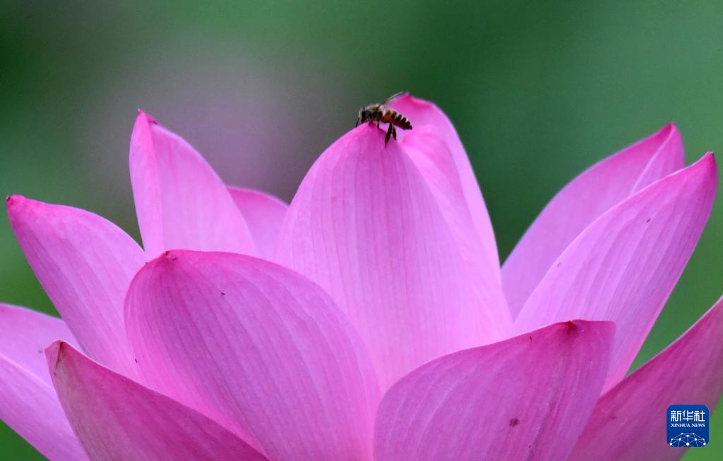 6月14日,河北省石家庄市栾城区柴武台公园荷塘,蜜蜂落在荷花上。