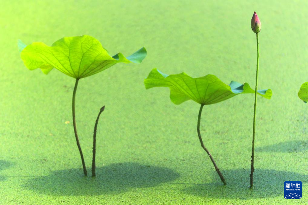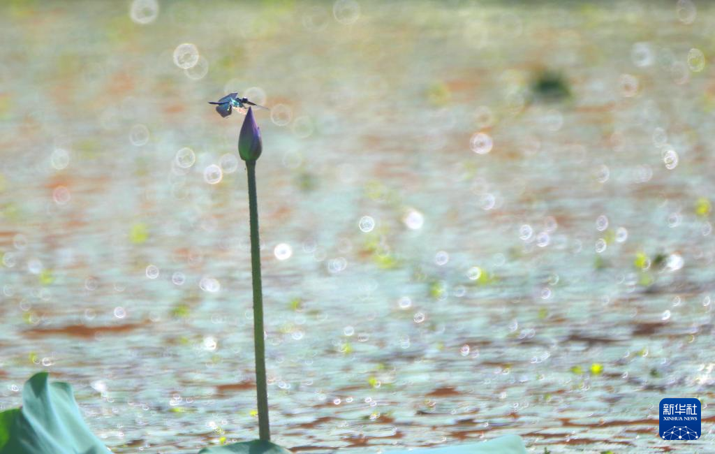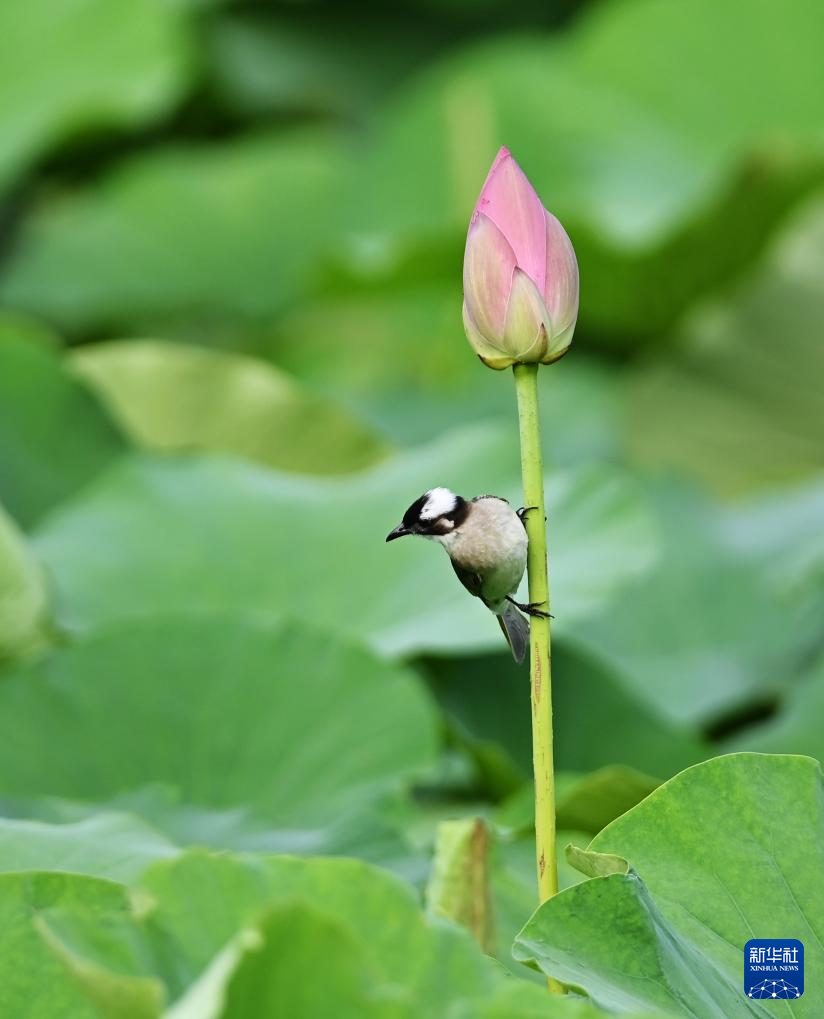 6月14日,在山东省滕州市龙泉广场荷花池,一只小鸟在花茎上停留。