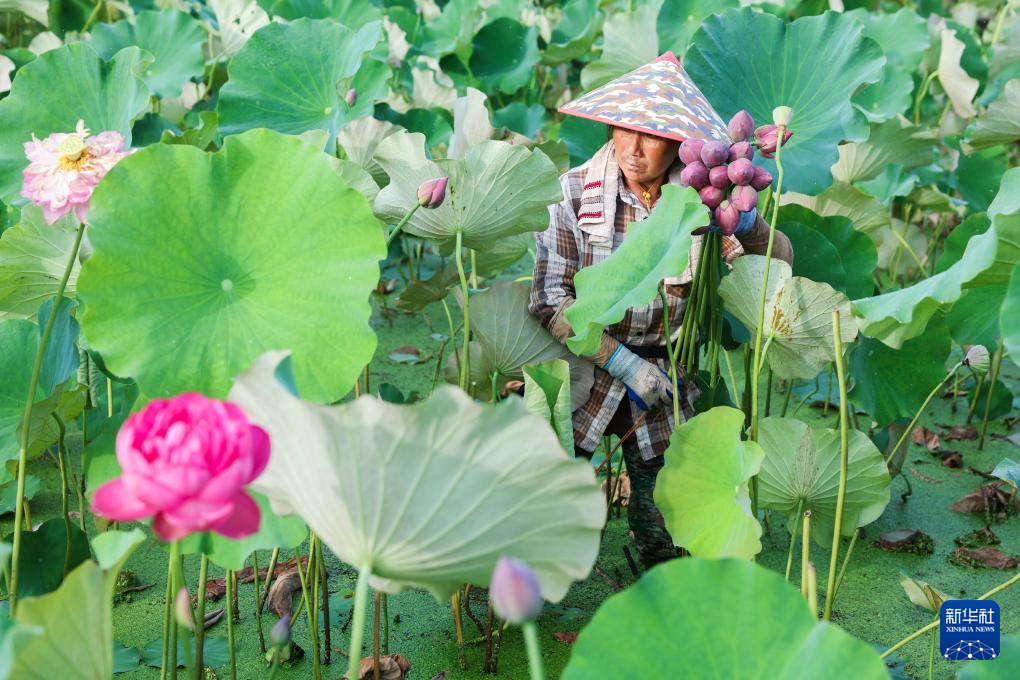 浙江省金华市武义县柳城镇是当地著名的荷花之乡。位于柳城镇的十里荷花共富工坊通过“基地+合作社+农户”模式,提供荷花种苗给村民种植,打通荷花种植、产品加工、产品包装、直播带货等全产业链,打造“宣平贡莲”地方特色品牌,带动周边各村数百户村民在家门口增收致富。(徐昱)