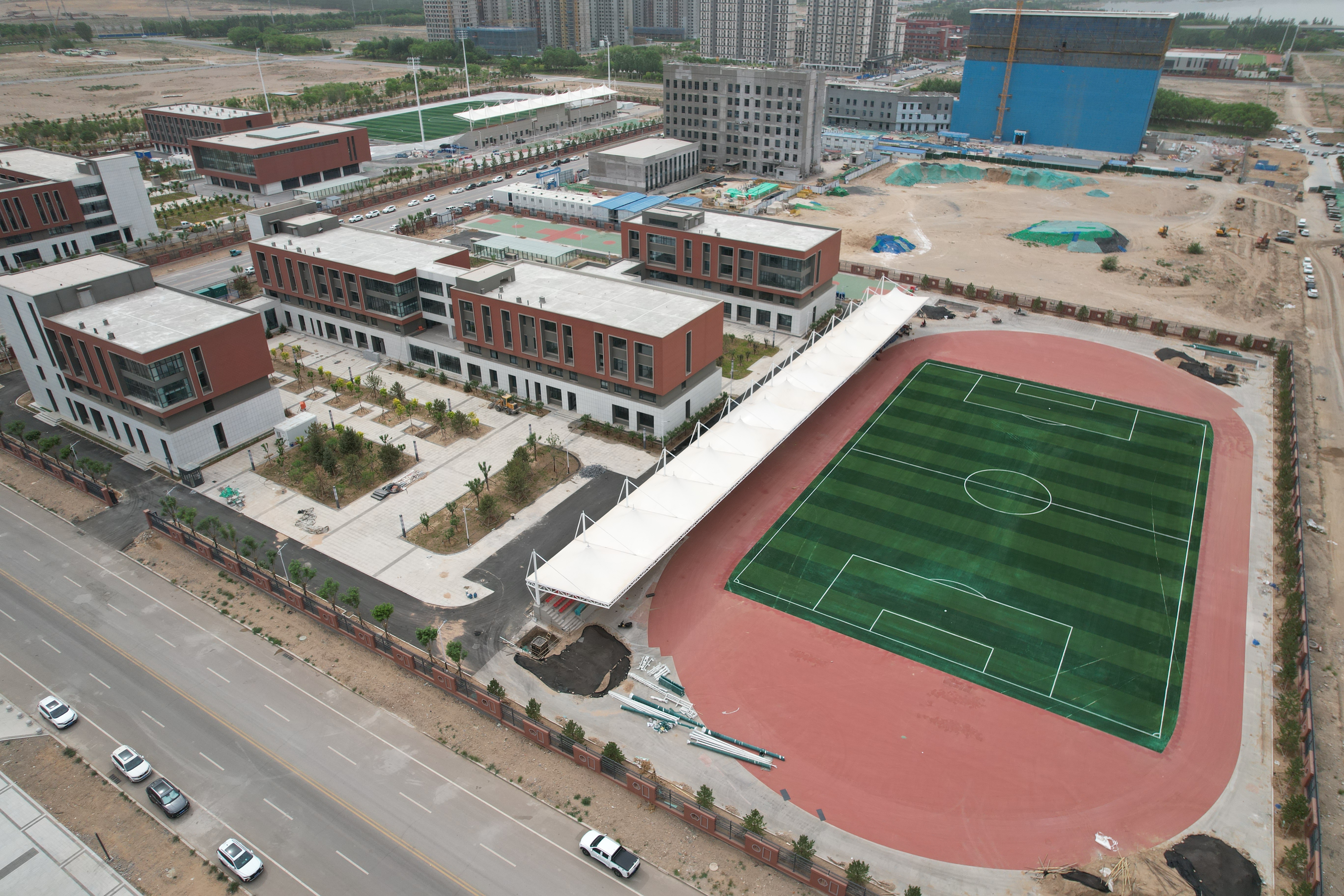 6月13日,记者在内蒙古师范大学附属海勃湾学校(市第十一中学)项目现场看到,小学部和初中部的教学楼、综合楼等内部装修和水电安装工程已基本完成,工人们正在进行操场周边的硬化工作。目前,学校建设已进入最后冲刺阶段,主体结构已全部完成,整体项目进度已达到99%,将于今年秋季学期正式投入使用。