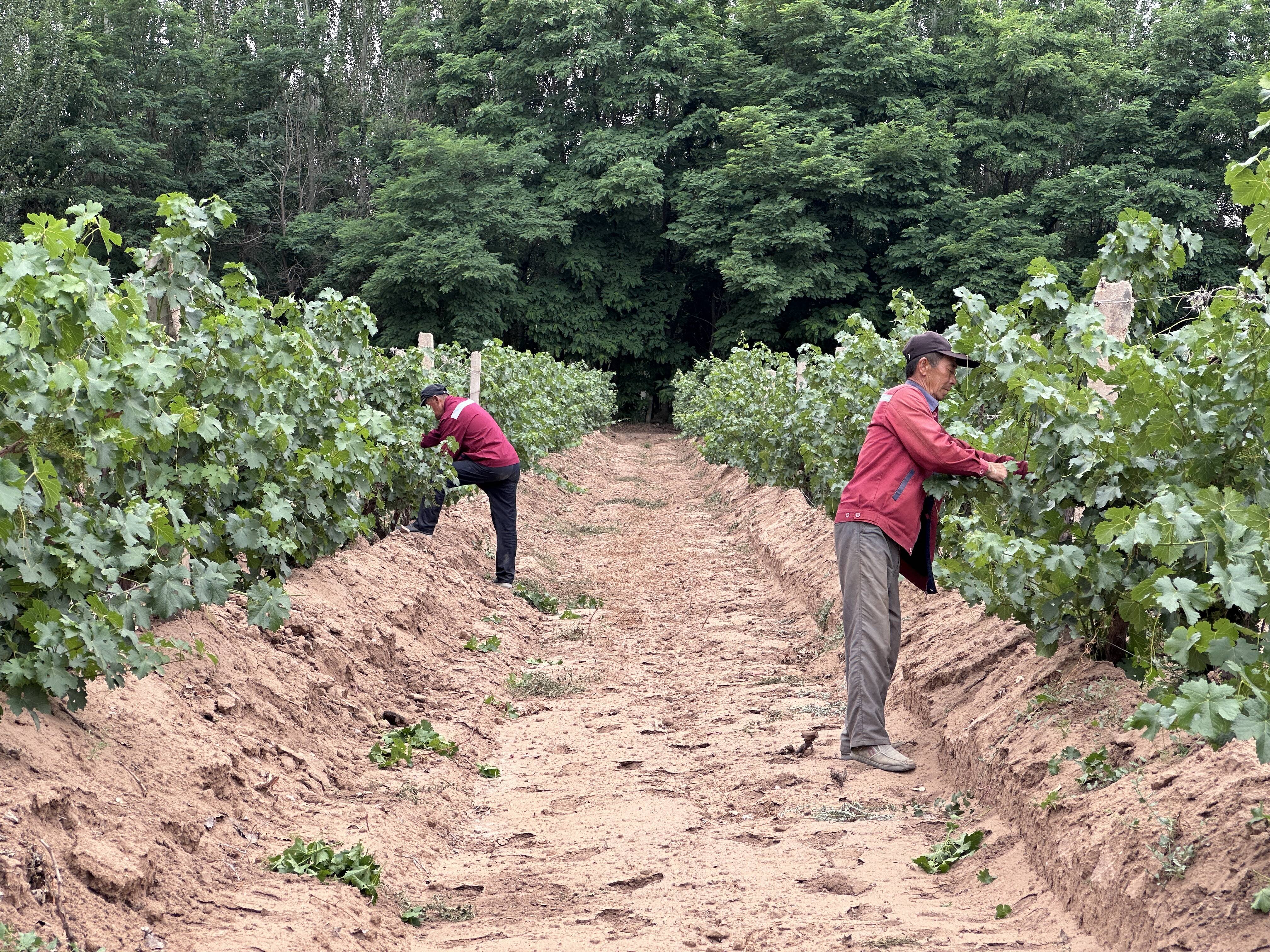 与此同时,在乌达区乌兰淖尔镇吉奥尼酒庄的葡萄种植区,工人们正有条不紊地开展各项管理工作。有的手持剪刀,精准地修剪着多余的枝条;有的蹲在藤架下,检查每一串葡萄的生长情况,将发育不良、过密的果粒摘除。