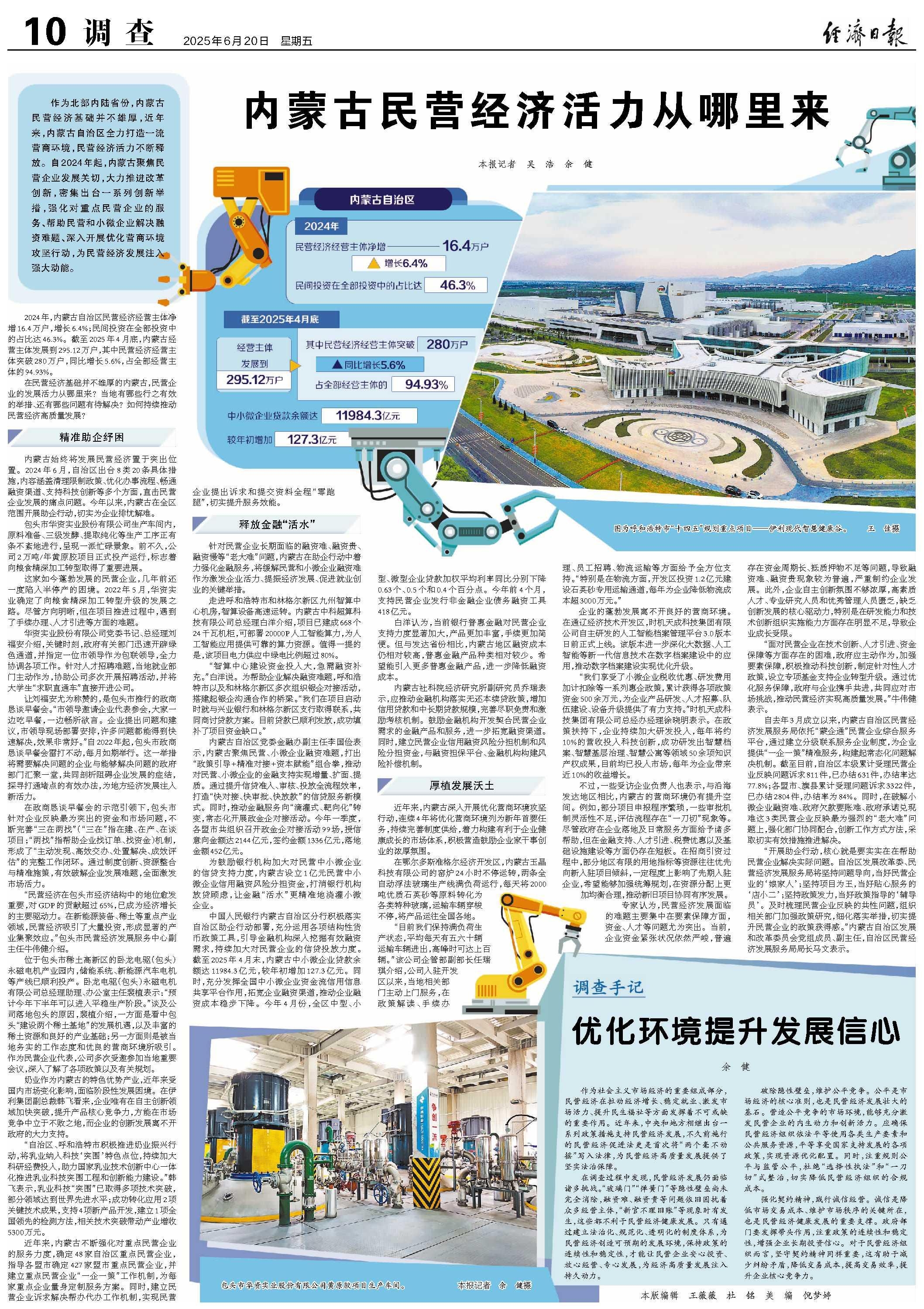 作为北部内陆省份,内蒙古民营经济基础并不雄厚,近年来,内蒙古自治区全力打造一流营商环境,民营经济活力不断释放。自2024年起,内蒙古聚焦民营企业发展关切,大力推进改革创新,密集出台一系列创新举措,强化对重点民营企业的服务、帮助民营和小微企业解决融资难题、深入开展优化营商环境攻坚行动,为民营经济发展注入强大动能。