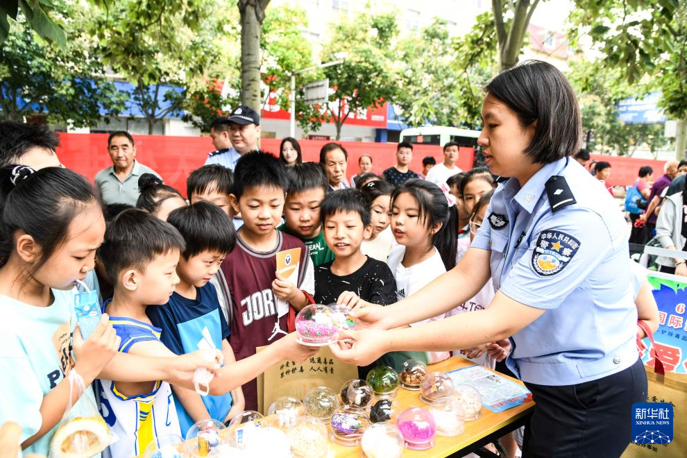 6月26日,在河南省济源市源园广场,民警通过仿真毒品模型讲解禁毒知识。(苗秋闹)