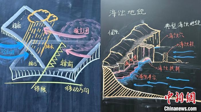 给他一支彩色粉笔,他能信手画出生动的“水循环图”、逼真的“大气环流”、立体的“海蚀地貌”……