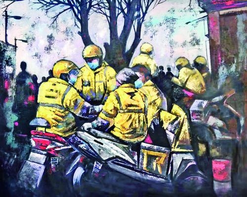 在创作中,郎彪更倾向于外卖员、消防员等冲锋在一线的人员。他说:“美术要为人民服务,歌颂的就是普通人。外卖员身着黄色、蓝色制服,色彩鲜艳,很容易入画。”