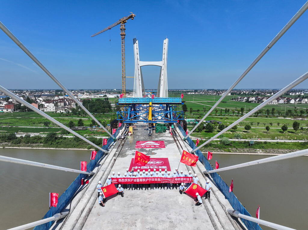 沪渝蓉高铁通泰扬特大桥全长172.9公里,跨越江苏南通、泰州、扬州三市。此次合龙的跨引江河斜拉桥全长522.3米,主跨220米,是沪渝蓉高铁沪宁段首个实现合龙的斜拉桥。作为全线关键控制性节点工程,该桥的顺利合龙为沪渝蓉高铁通泰扬特大桥后续铺轨及全线贯通创造了有利条件。