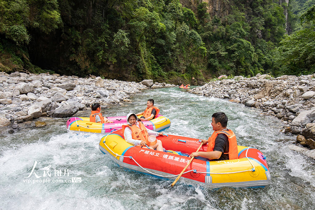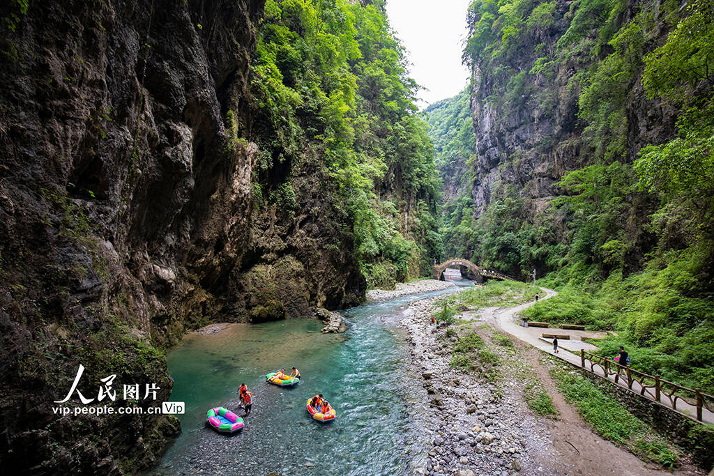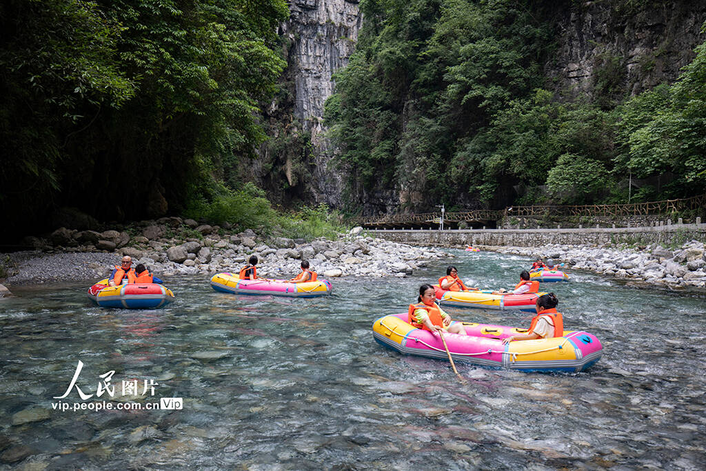 7月1日,贵州省遵义市桐梓县木瓜镇水银村的水银河大峡谷景区,游客正在体验峡谷漂流,乐享夏日清凉。(孙凯芳)